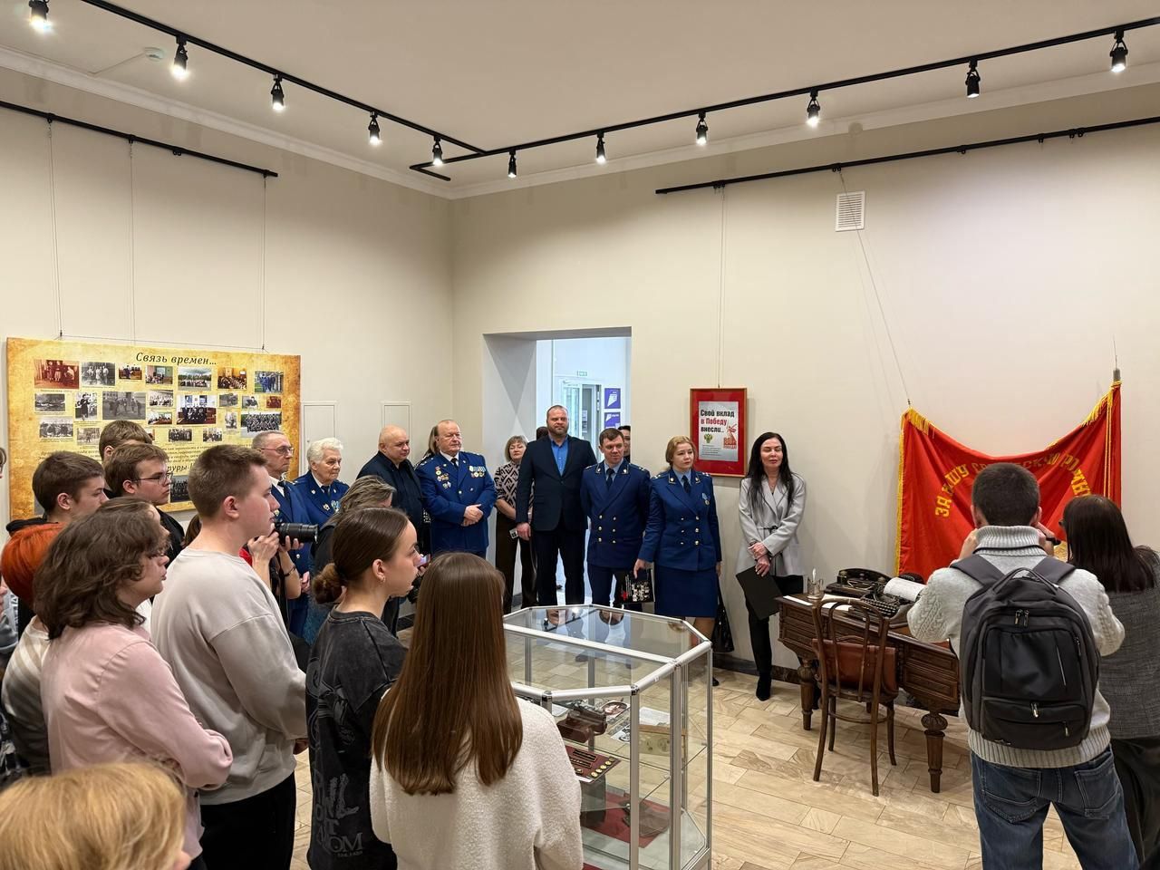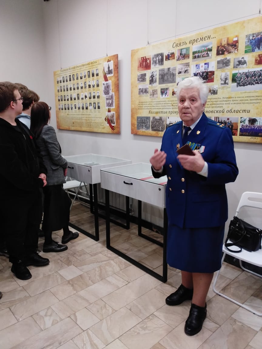 Прокурор района Павел Михайлович Кашин, автор книги «Ивановские прокуроры и Великая Отечественная война 1941-1945 гг.» Кручинина Валентина Владимировна, почетные работники, ветераны прокуратуры Владимир Ксенофонтович Прыгунов, Нина Ивановна Бровкина, Евгений Иванович Романский, Владимир Николаевич Мерьков обратились к учащимся гимназии № 1 г. Шуя и другим присутствующим на мероприятии с приветственной речью. Ветераны приняли участие в проведении экскурсии по экспозиции. Они рассказали о непростых судьбах и сильных несгибаемых характерах прокуроров – участников Великой Отечественной войны.