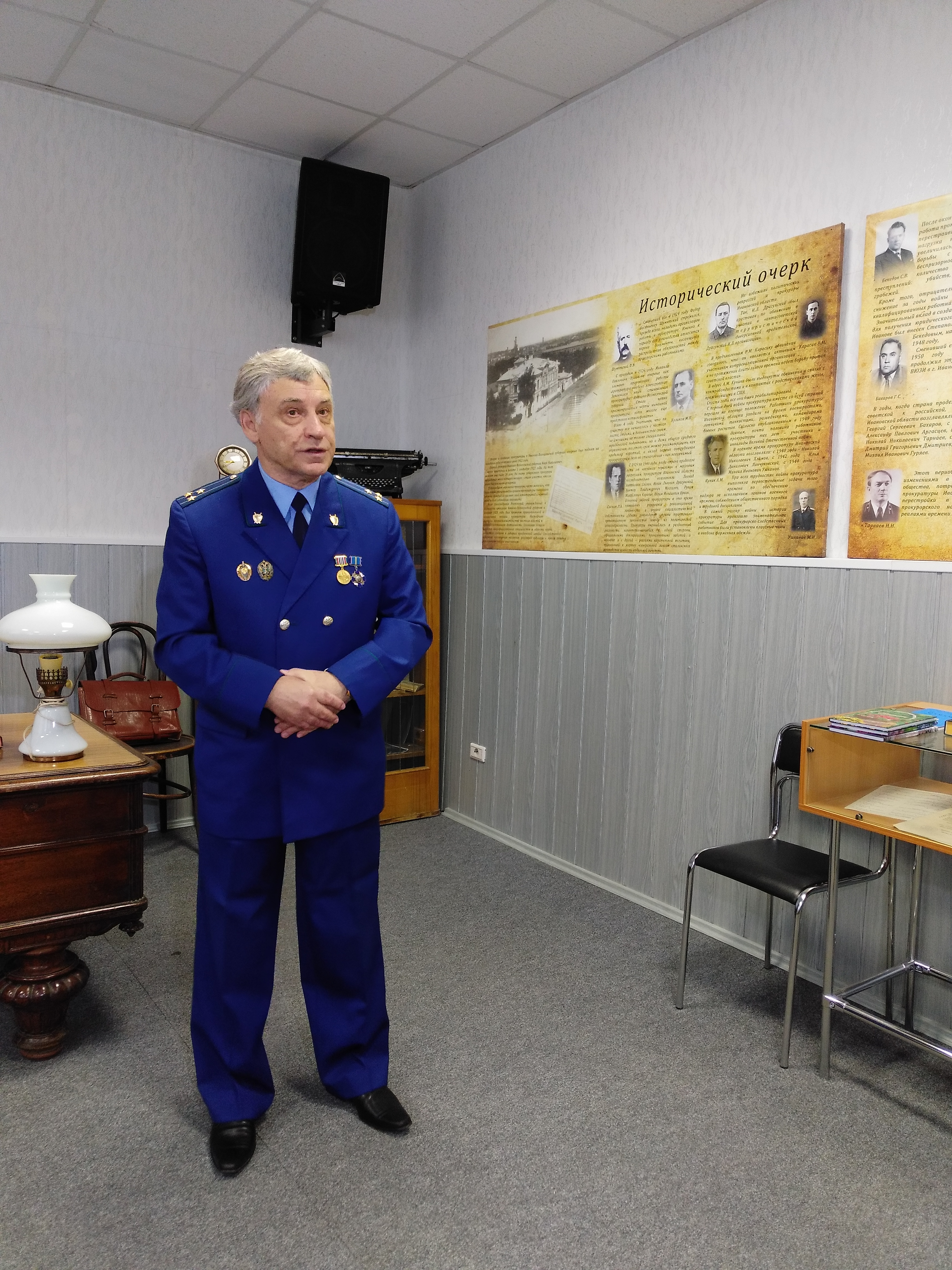 В музее прокуратуры Ивановской области почетный работник прокуратуры Копытов Александр Владимирович, который до выхода на пенсию служил в должности старшего помощника прокурора области, поведал молодым работникам прокуратуры о годах прохождения службы, своих коллегах.