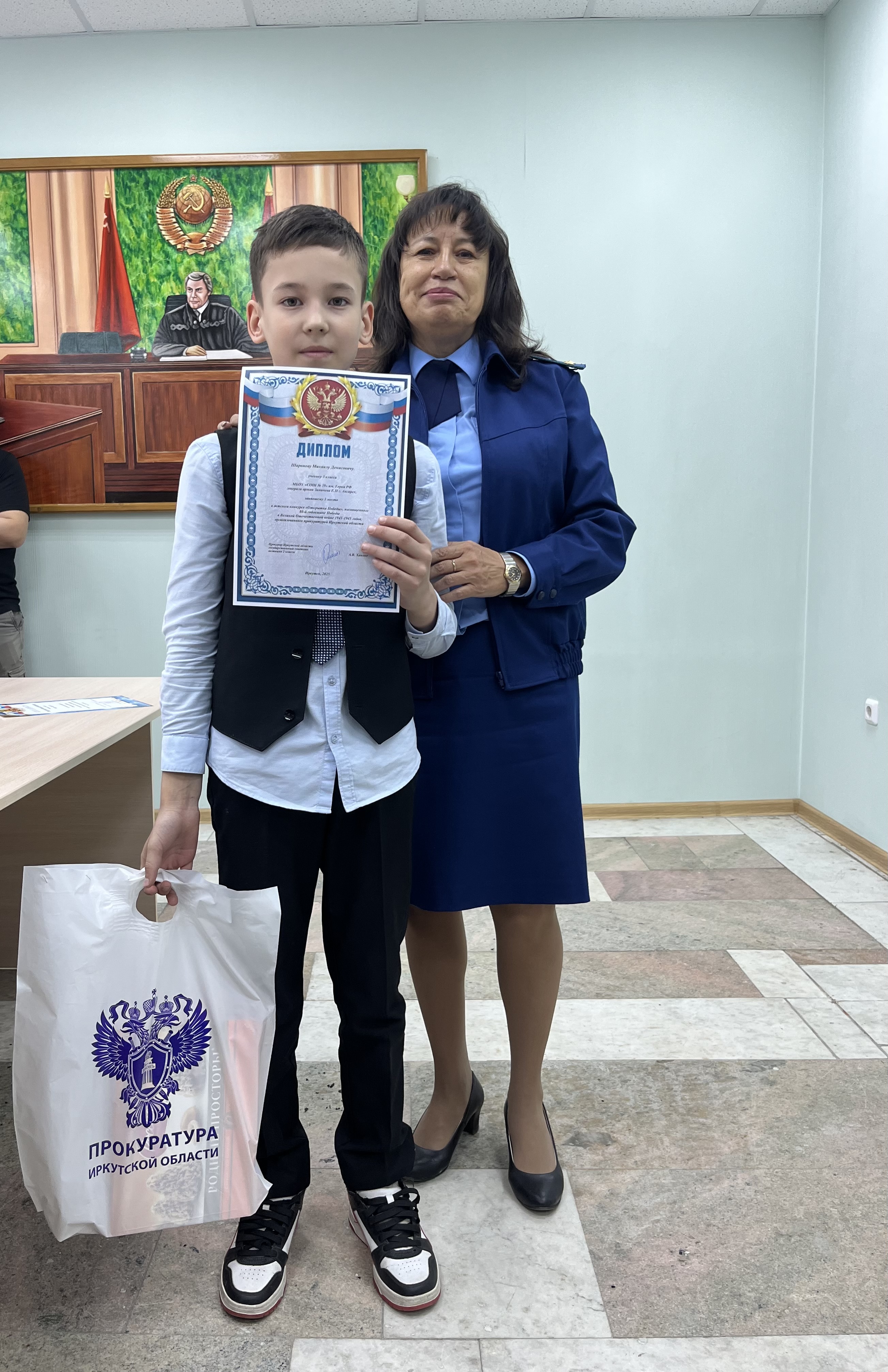 Призером областного конкурса стал ученик 3 класса МБОУ «СОШ № 39» имени героя РФ генерала армии Зиничева Е.Н. – Шаронов Михаил, который занял 3 место. Также отдельно поощрена благодарственным письмом прокурора Иркутской области ученица 3 класса этой же школы Коробко Мария.