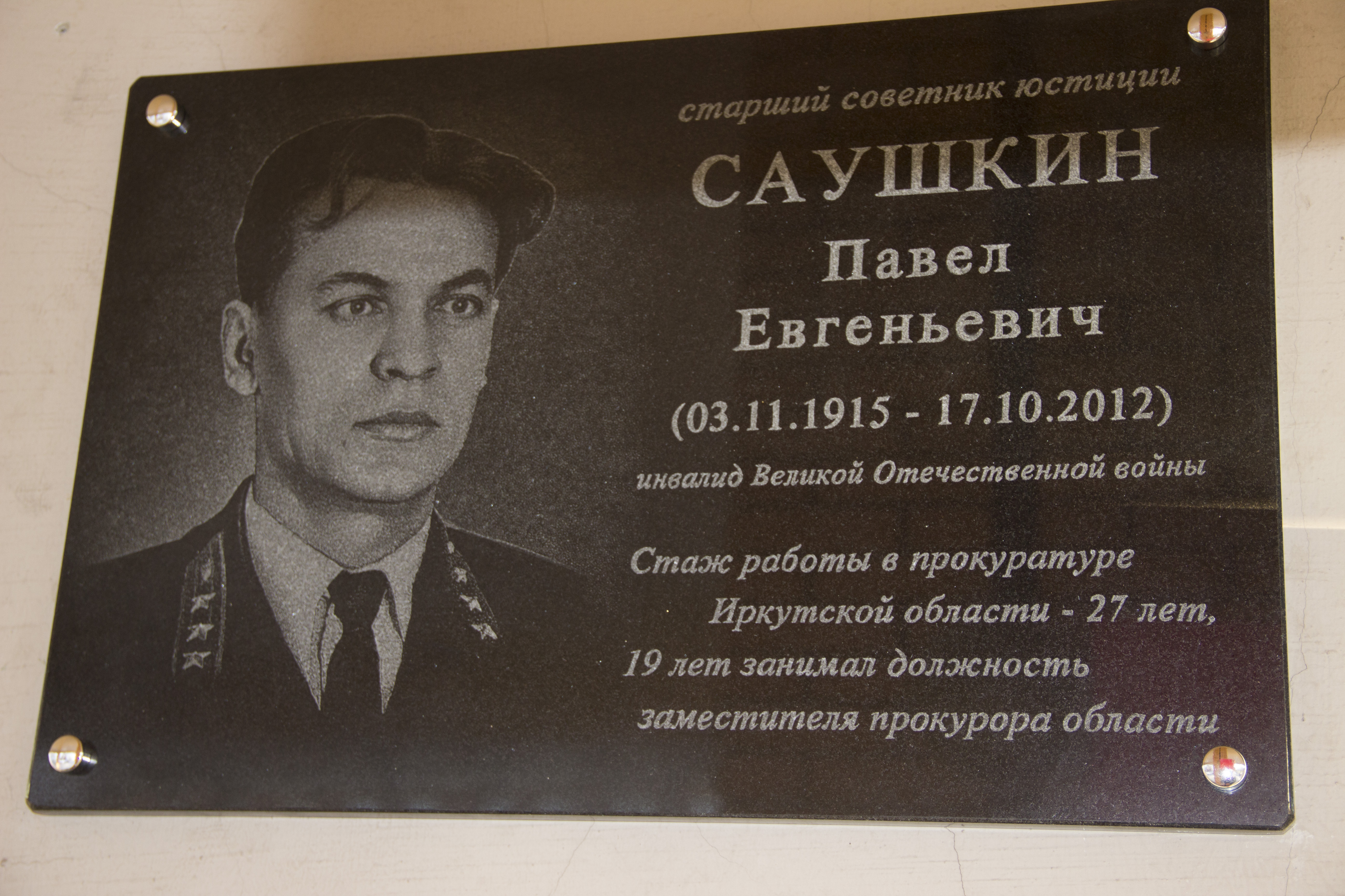 В преддверии 300-летия прокуратуры России состоялось торжественное открытие мемориальной доски инвалиду Великой Отечественной войны, кавалеру орденов «Красной Звезды», «Отечественной войны» I степени, «Знака Почета» и большого числа медалей за боевые и трудовые заслуги, ветерану прокуратуры Иркутской области Павлу Евгеньевичу Саушкину.
