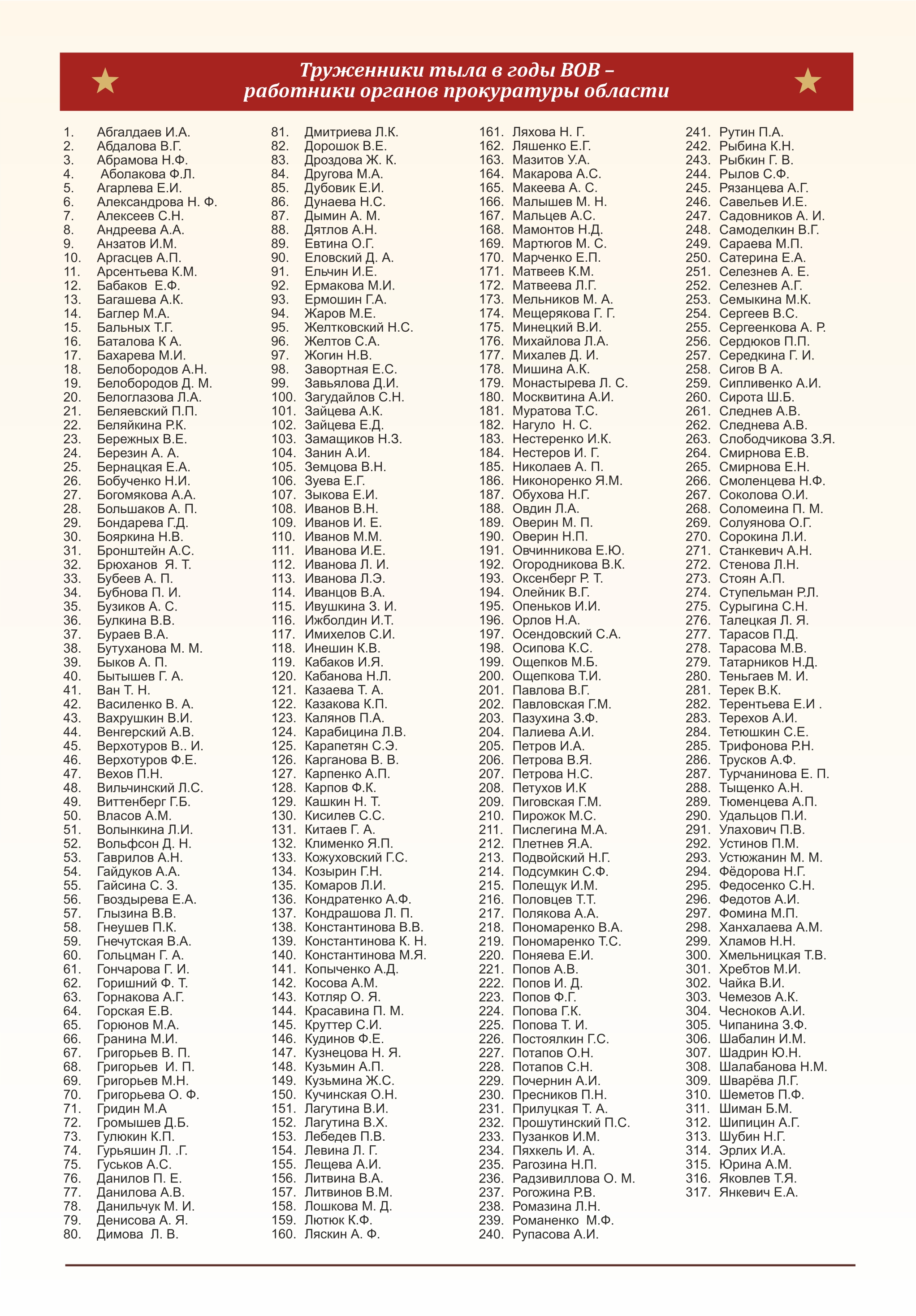 В специальном выпуске № 13 опубликованы выверенные и дополненные списки работников всех органов прокуратуры области - 302 ветеранов Великой Отечественной войны и 317 труженников тыла в годы ВОВ.