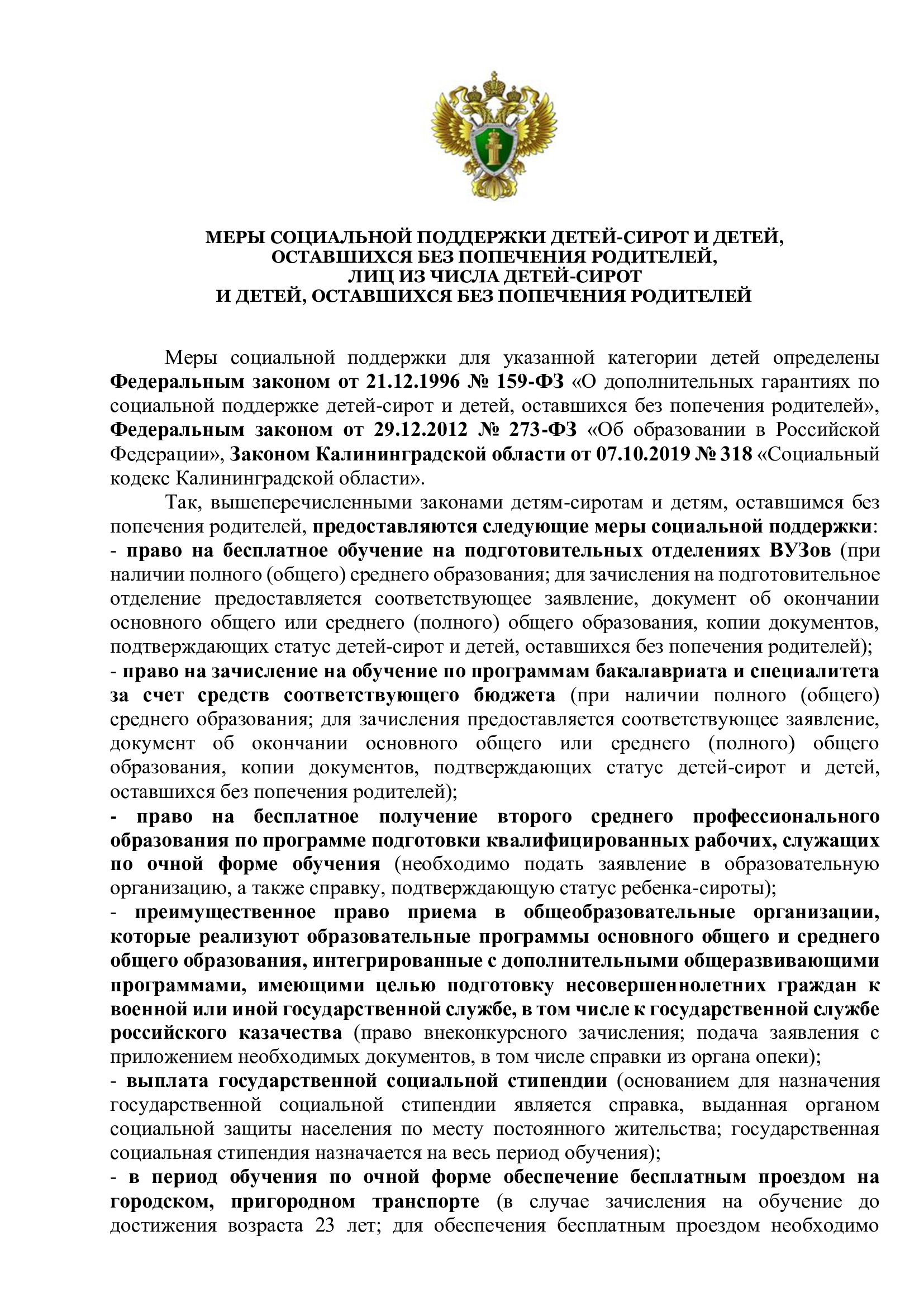 Меры социальной поддержки для указанной категории детей определены Федеральным законом от 21.12.1996 № 159-ФЗ «О дополнительных гарантиях по социальной поддержке детей-сирот и детей, оставшихся без попечения родителей», Федеральным законом от 29.12.2012 № 273-ФЗ «Об образовании в Российской Федерации», Законом Калининградской области от 07.10.2019 № 318 «Социальный кодекс Калининградской области».