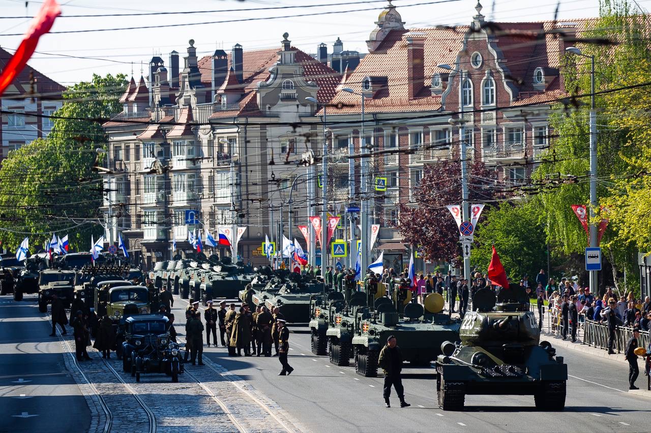Во время парада по центру города прошли военнослужащие Балтийского флота, парадные расчеты силовых структур и военных вузов. Демонстрацию военной техники возглавил танк Т-34, который принимал участие в штурме Кенигсберга. В состав механизированной колонны было включено более 70 единиц военной техники.