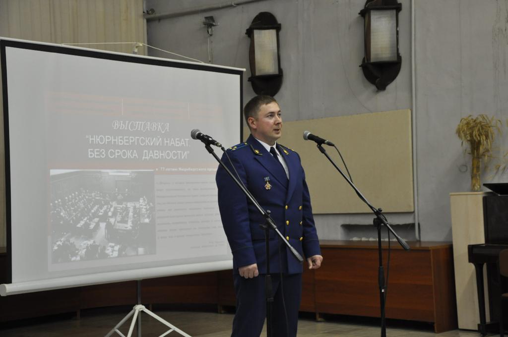 Прокурор Боровского района, открывая выставку, отметил историческую значимость Нюрнбергского процесса, его актуальность, а также ценность представленных экспозиций.