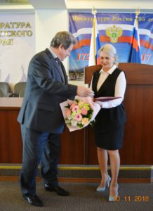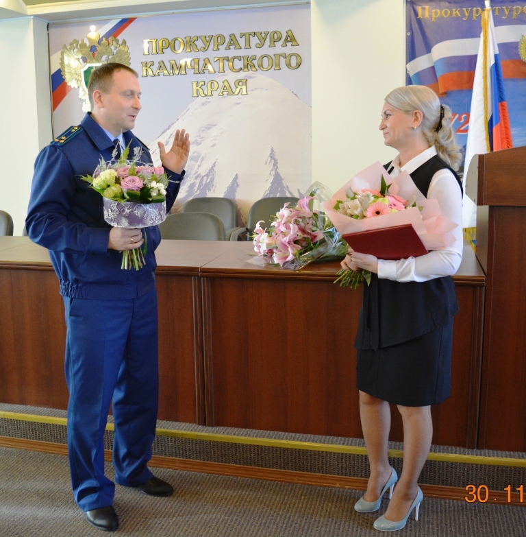 На торжественном собрании, состоявшемся в актовм зале прокуратуры 30 ноября, прокурор края Анатолий Гаврилович Князев поблагодарил Елену Соломянникову за многолетний добросовестный труд. Прокурор города Александр Янин, Камчатский межрайонный природоохранный прокурор Михаил Новицкий и другие коллеги сказали Елене Анатольевне много добрых слов о совместной работе, пожелали новых успехов и достижений, здоровья и благополучия.