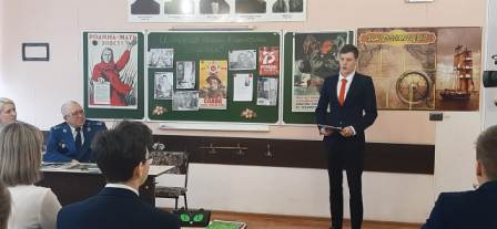 Ученики 10 класса социально-экономического профиля встретились с представителями прокуратуры: председателем совета ветеранов прокуратуры области Николаем Янкиным и помощником прокурора г. Прокопьевска Людмилой Рудяковой.