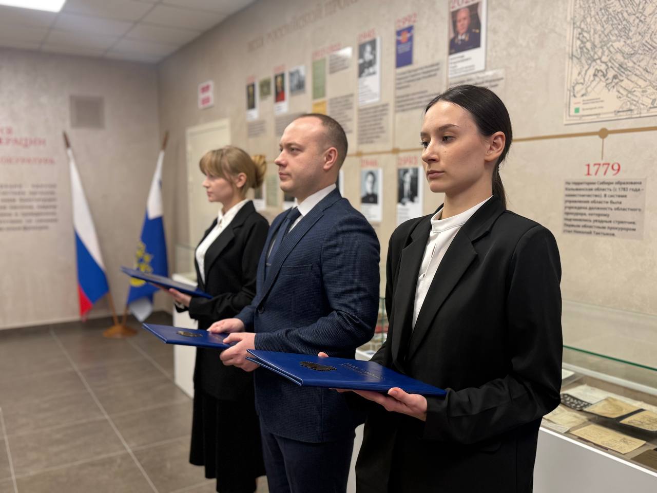 Сегодня, после успешного прохождения аттестации молодые специалисты — помощники прокуроров г. Таштагола Анастасия Симановская, Центрального района г. Новокузнецка Алексей Зайцев, Ленинского района г. Кемерово Алена Казанцева в присутствии руководства прокуратуры области в помещении музея прокуратуры Кемеровской области - Кузбасса приняли Присягу прокурора.