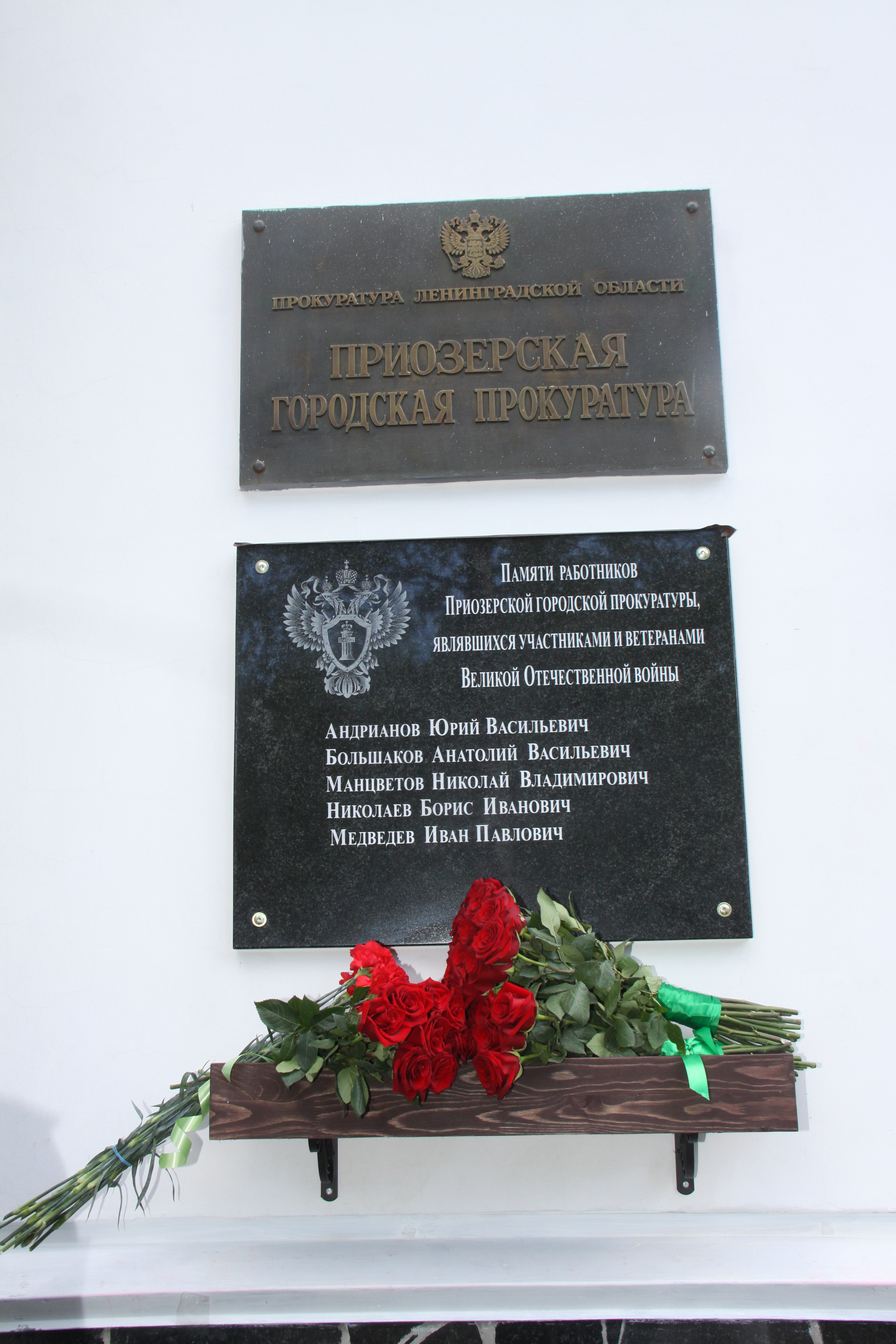 27 мая 2021 года в Приозерском районе состоялось торжественное мероприятие, посвященное открытию мемориальной доски памяти работников Приозерской городской прокуратуры являвшихся участниками Великой Отечественной войны.