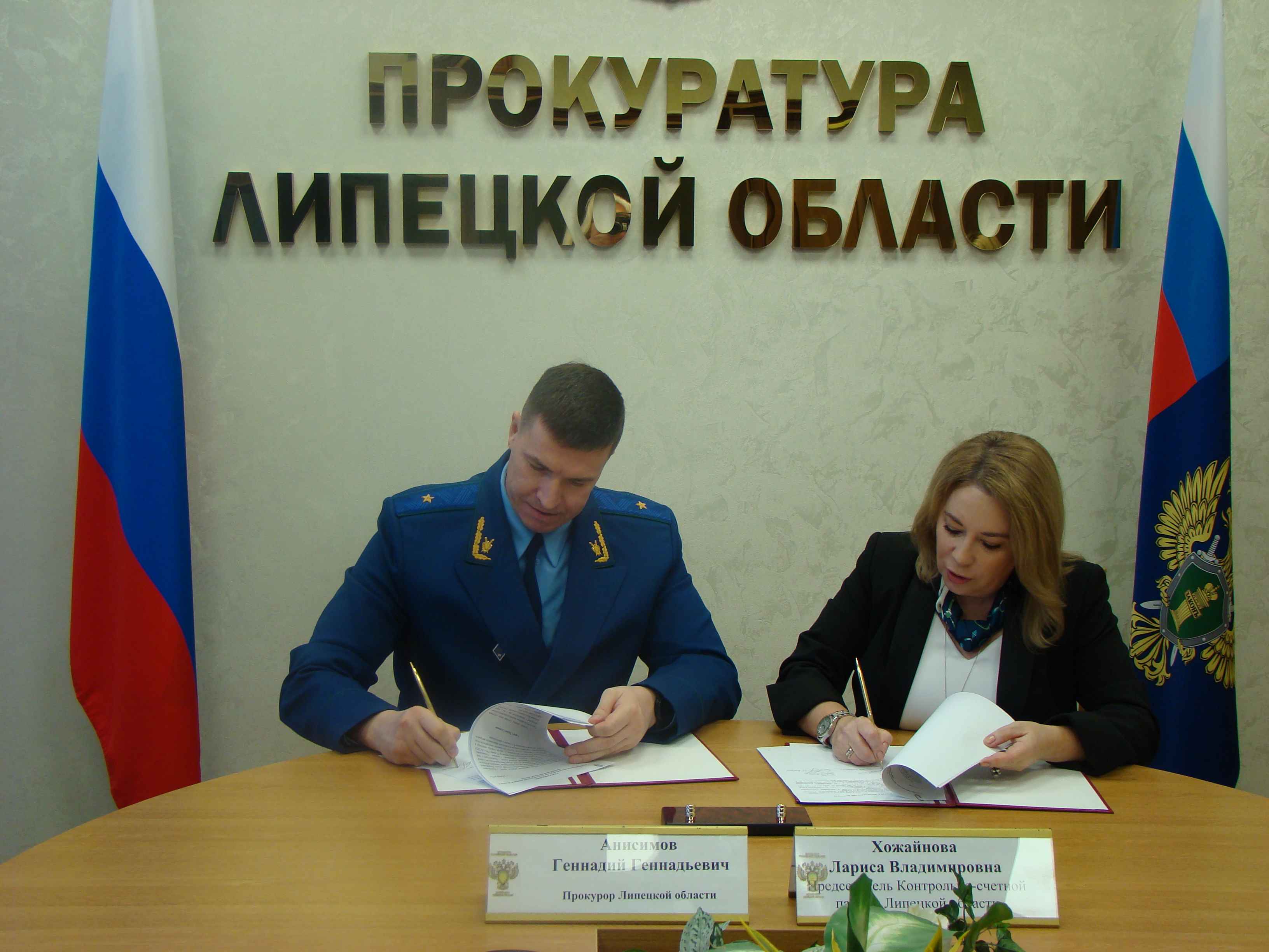 Прокурор области Геннадий Анисимов и председатель Контрольно - счётной палаты Липецкой области Лариса Хожайнова подписали Соглашение о сотрудничестве между прокуратурой Липецкой области и Контрольно-счетной палатой Липецкой области