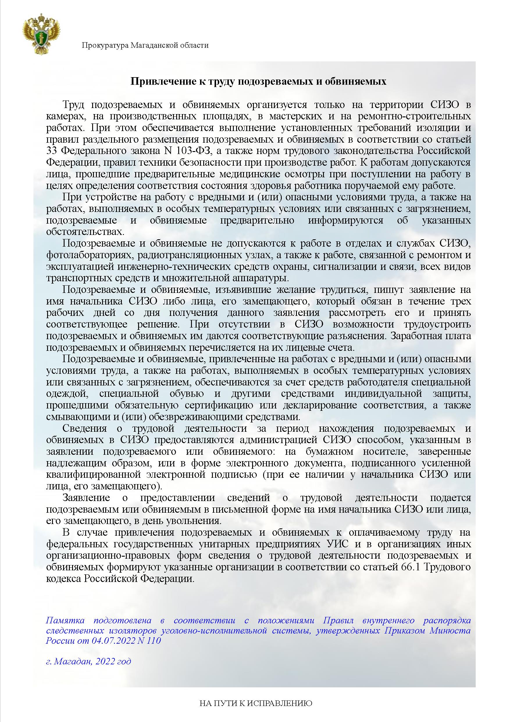 Памятка подготовлена в соответствии с положениями Правил внутреннего распорядка следственных изоляторов уголовно-исполнительной системы, утвержденных Приказом Минюста России от 04.07.2022 N 110