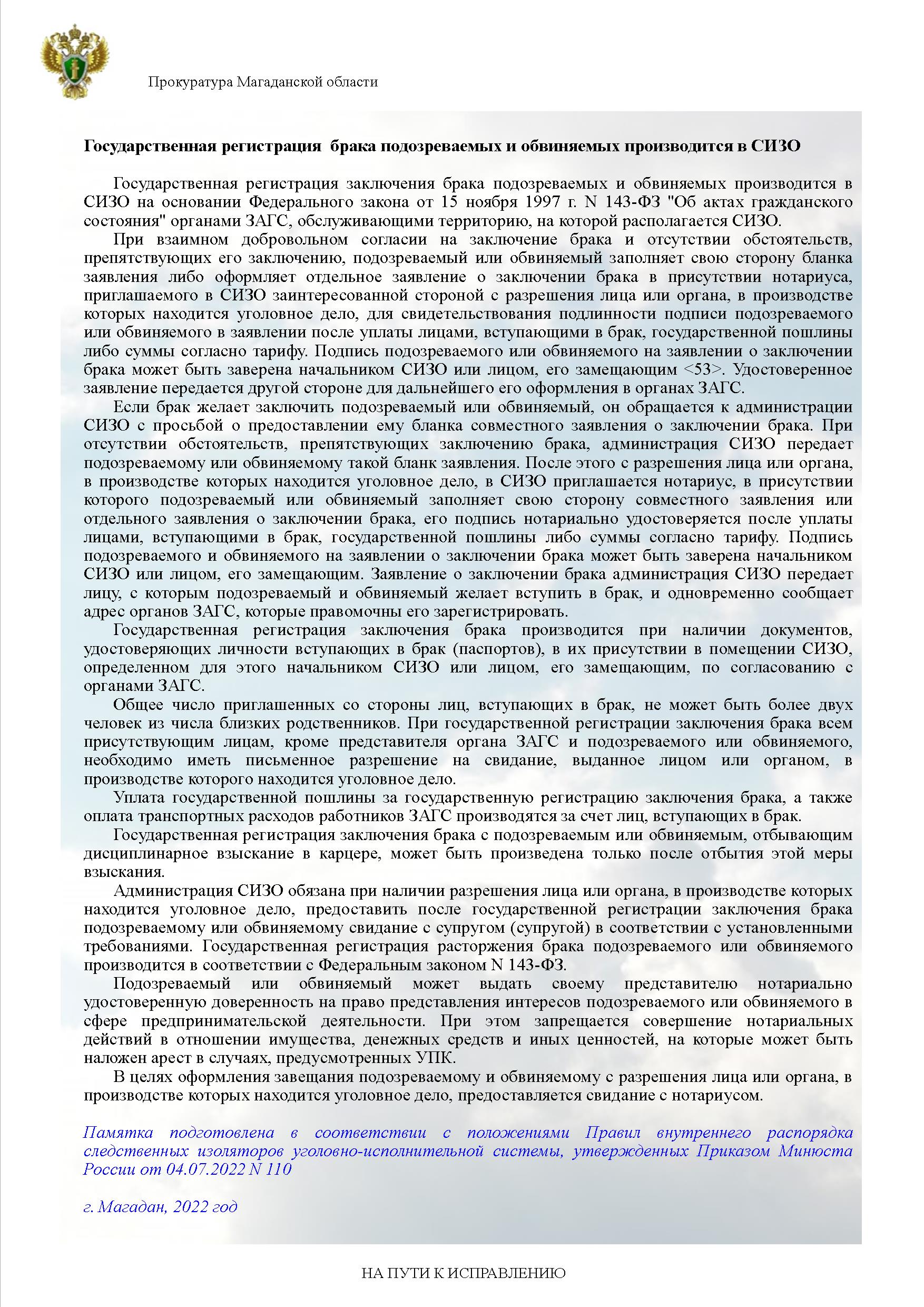 Государственная регистрация заключения брака подозреваемых и обвиняемых производится в СИЗО