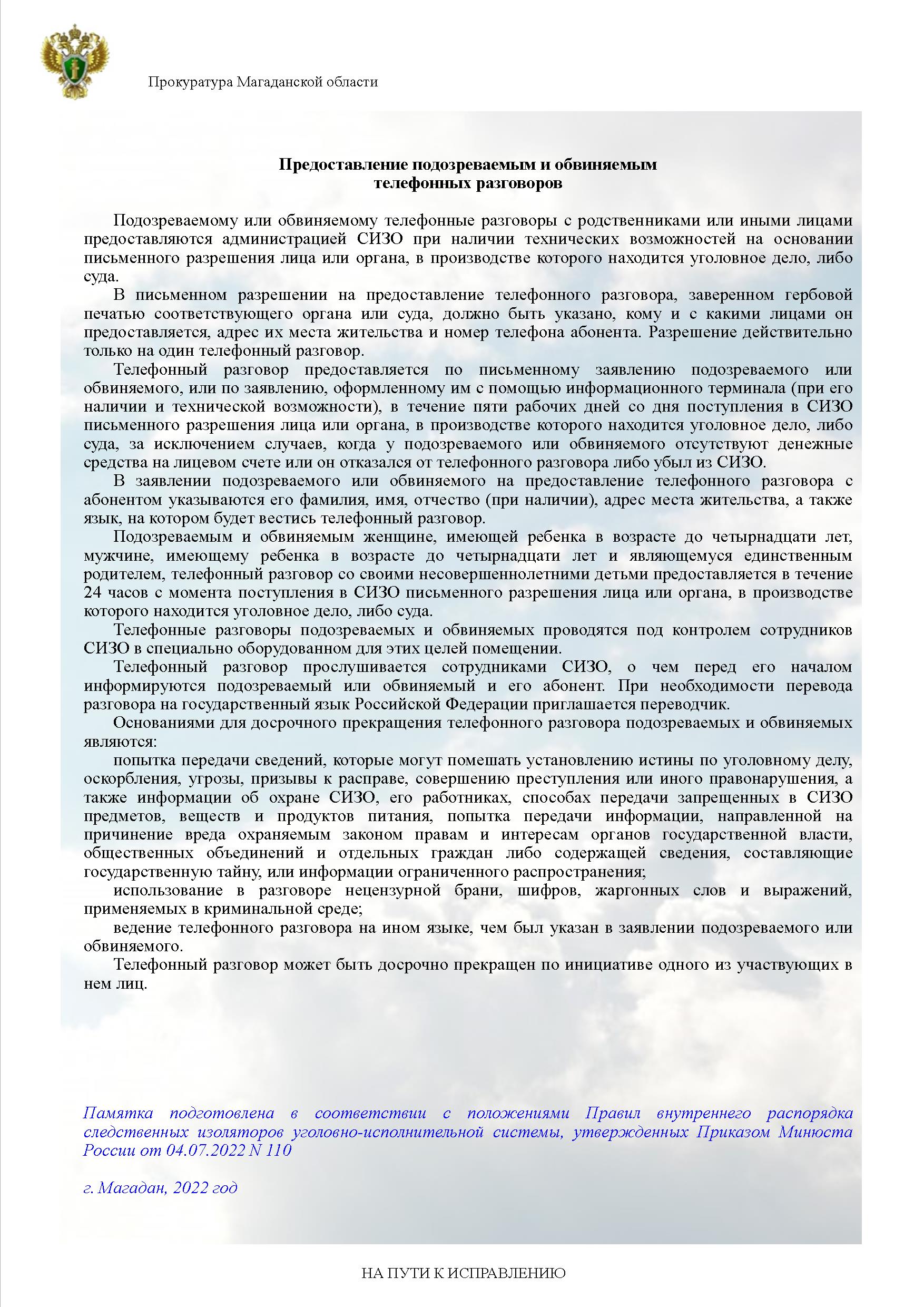 Памятка подготовлена в соответствии с положениями Правил внутреннего распорядка следственных изоляторов уголовно-исполнительной системы, утвержденных Приказом Минюста России от 04.07.2022 N 110