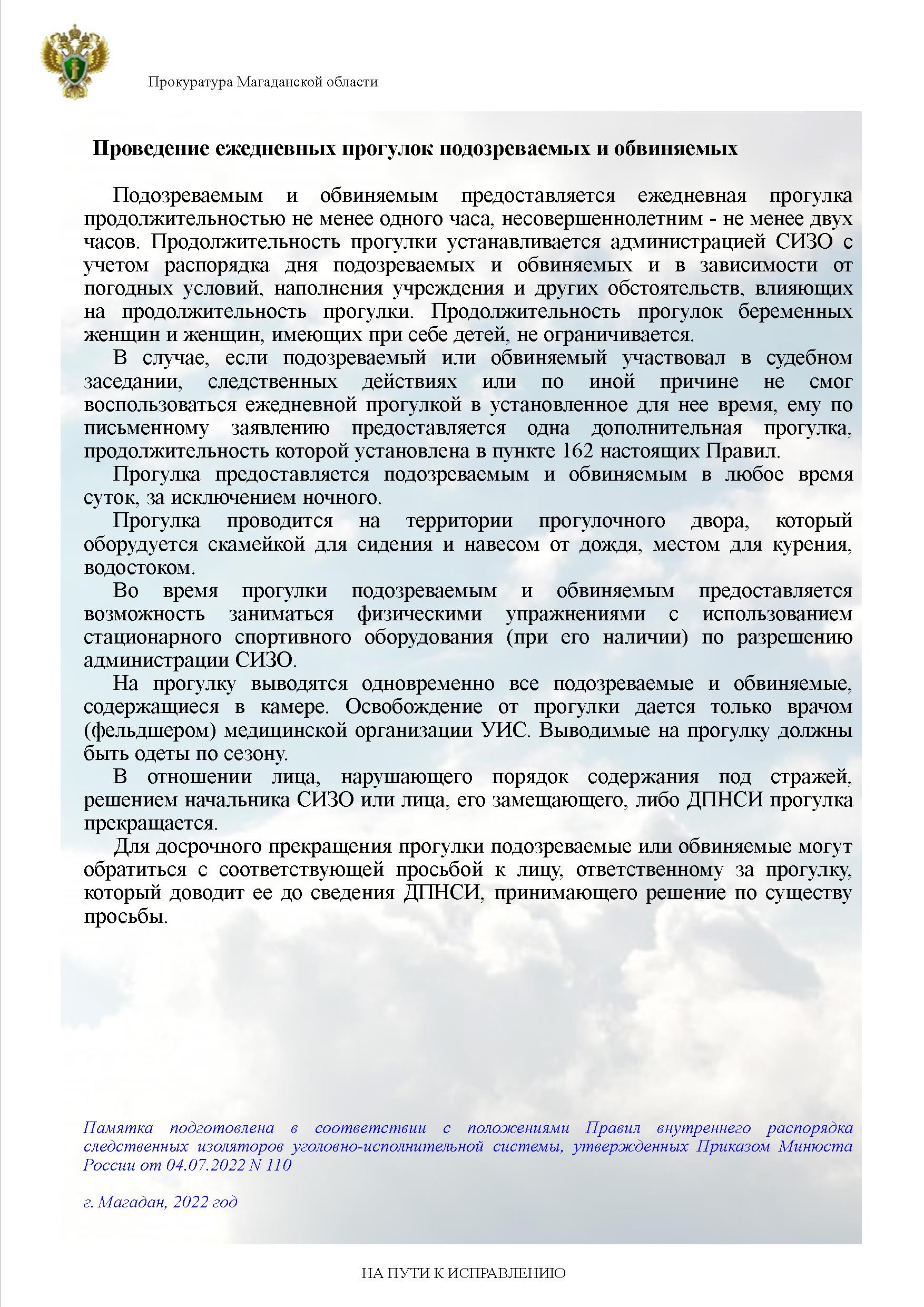 Памятка подготовлена в соответствии с положениями Правил внутреннего распорядка следственных изоляторов уголовно-исполнительной системы, утвержденных Приказом Минюста России от 04.07.2022 N 110