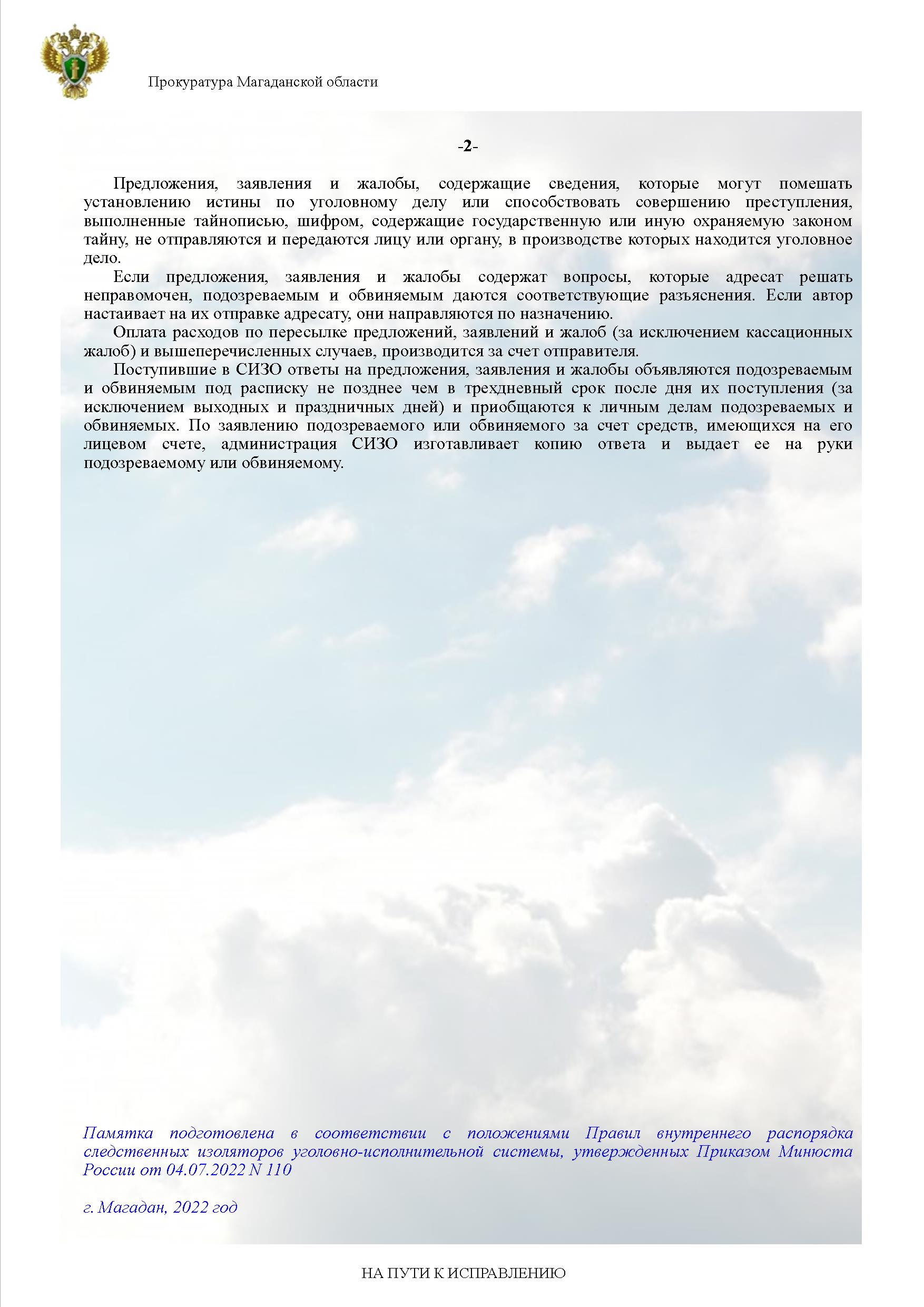 Памятка подготовлена в соответствии с положениями Правил внутреннего распорядка следственных изоляторов уголовно-исполнительной системы, утвержденных Приказом Минюста России от 04.07.2022 N 110