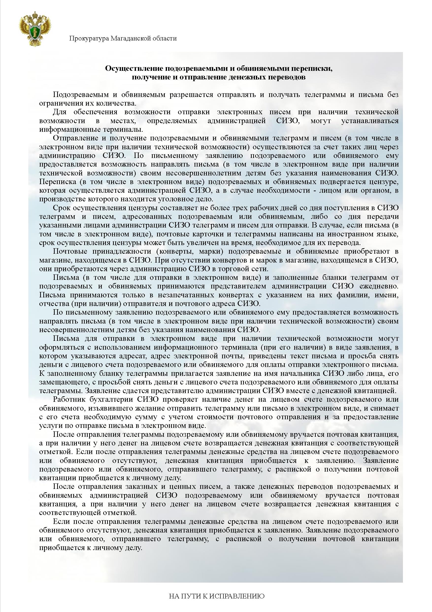 Осуществление подозреваемыми и обвиняемыми, содержащимися в СИЗО, переписки, получение и отправление денежных переводов