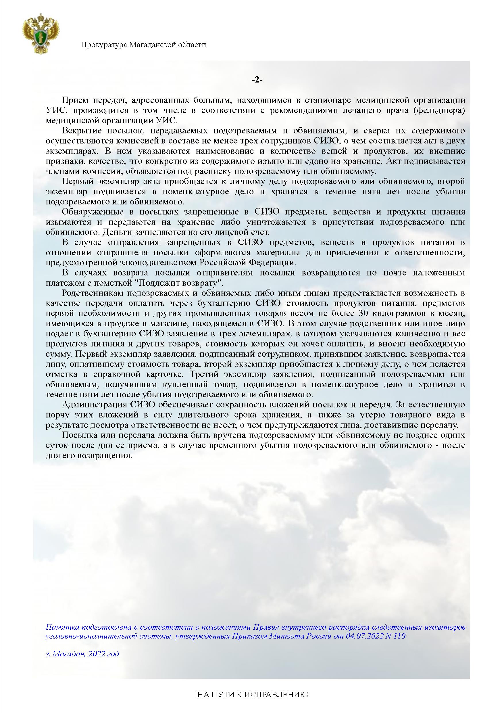 Памятка подготовлена в соответствии с положениями Правил внутреннего распорядка следственных изоляторов уголовно-исполнительной системы, утвержденных Приказом Минюста России от 04.07.2022 N 110