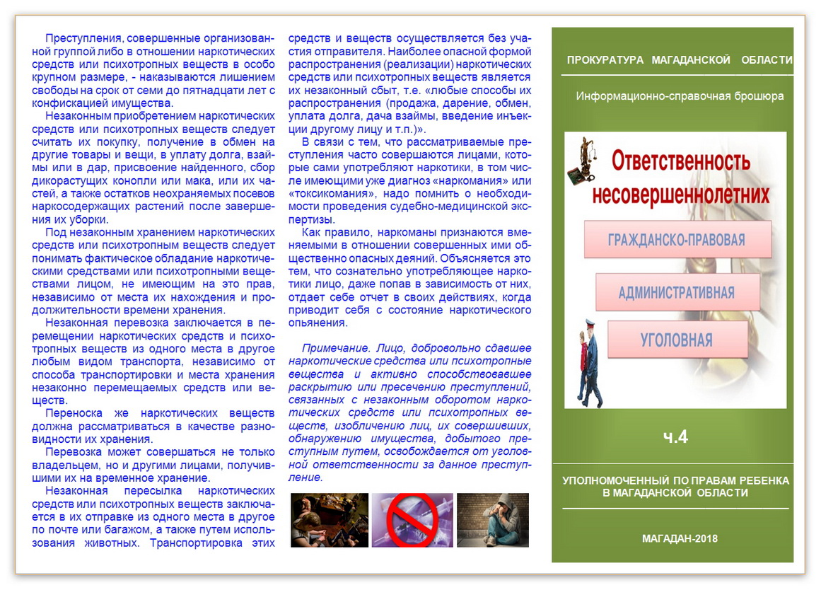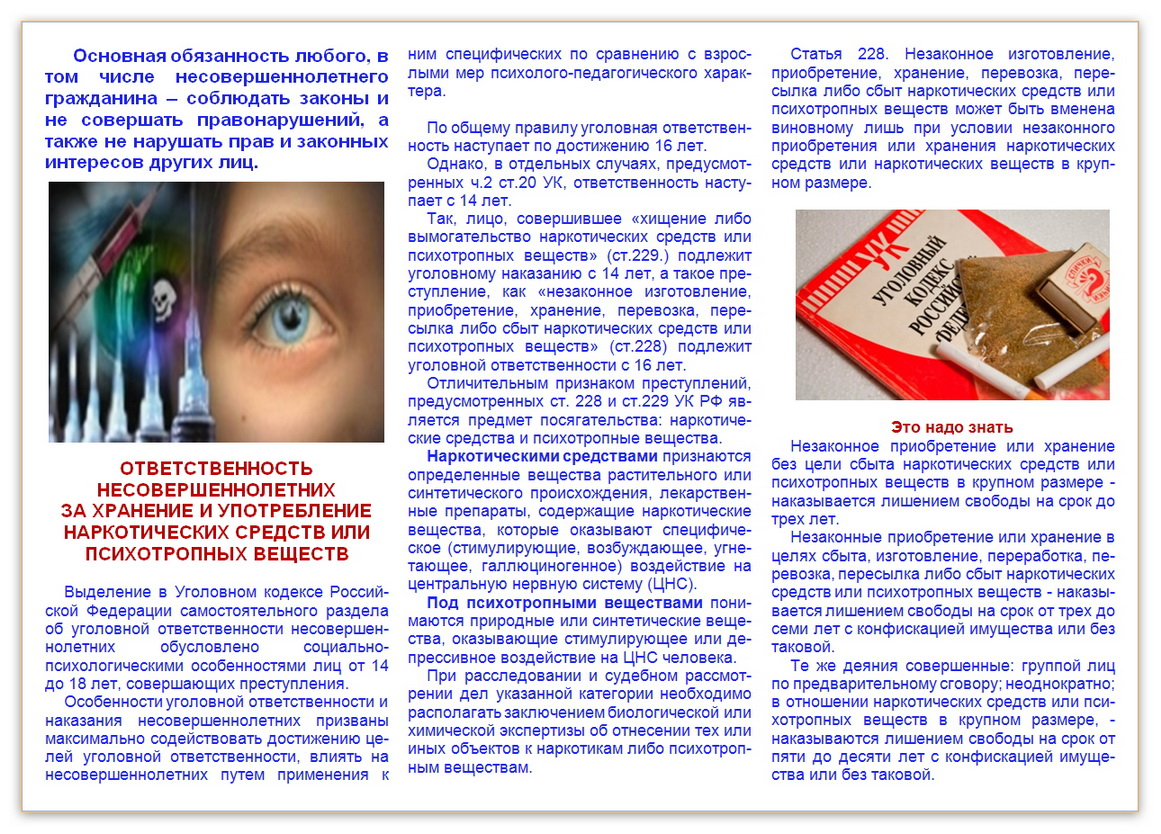 Ответственность несовершеннолетних: За хранение и употребление наркотических средств или психотропных веществ