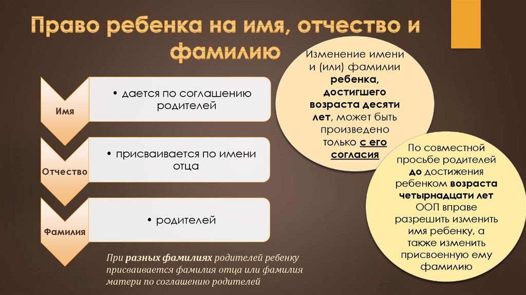 Имя ребенку дается по соглашению родителей, а отчество присваивается по имени отца, если иное не предусмотрено законами субъектов РФ или не основано на национальном обычае. При выборе имени не допускается использование цифр, буквенно-цифровых обозначений, числительных, символов и не являющихся буквами знаков, за исключением знака "дефис", а также бранных слов и указаний на ранги, должности, титулы.