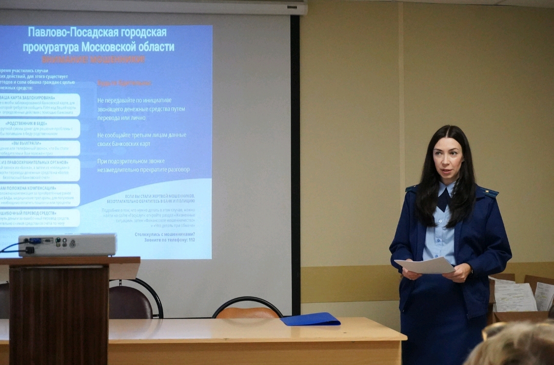 Старший помощник Павлово-Посадского городского прокурора Светлана Нагайцева провела встречу с работниками ГБУЗ МО «Павлово-Посадская больница», в ходе которой обращено внимание на возрастание угроз преступных посягательств в сфере дистанционного мошенничества.
