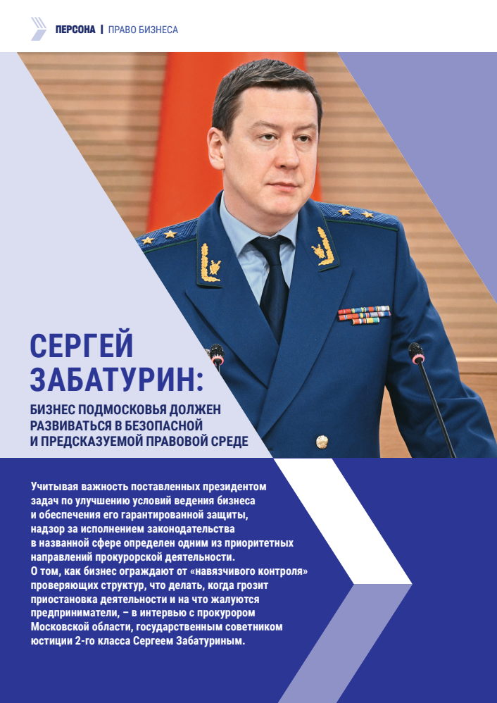 Учитывая важность поставленных президентом задач по улучшению условий ведения бизнеса и обеспечения его гарантированной защиты, надзор за исполнением законодательства в названной сфере определен одним из приоритетных направлений прокурорской деятельности. О том, как бизнес ограждают от «навязчивого контроля» проверяющих структур, что делать, когда грозит приостановка деятельности и на что жалуются предприниматели, – в интервью с прокурором Московской области, государственным советником юстиции 2-го класса Сергеем Забатуриным.