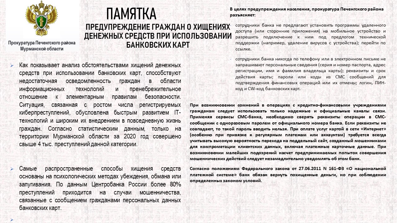 Памятка прокуратуры Печенгского района "Предупреждение граждан о хищениях денежных средств при использовании банковских карт"