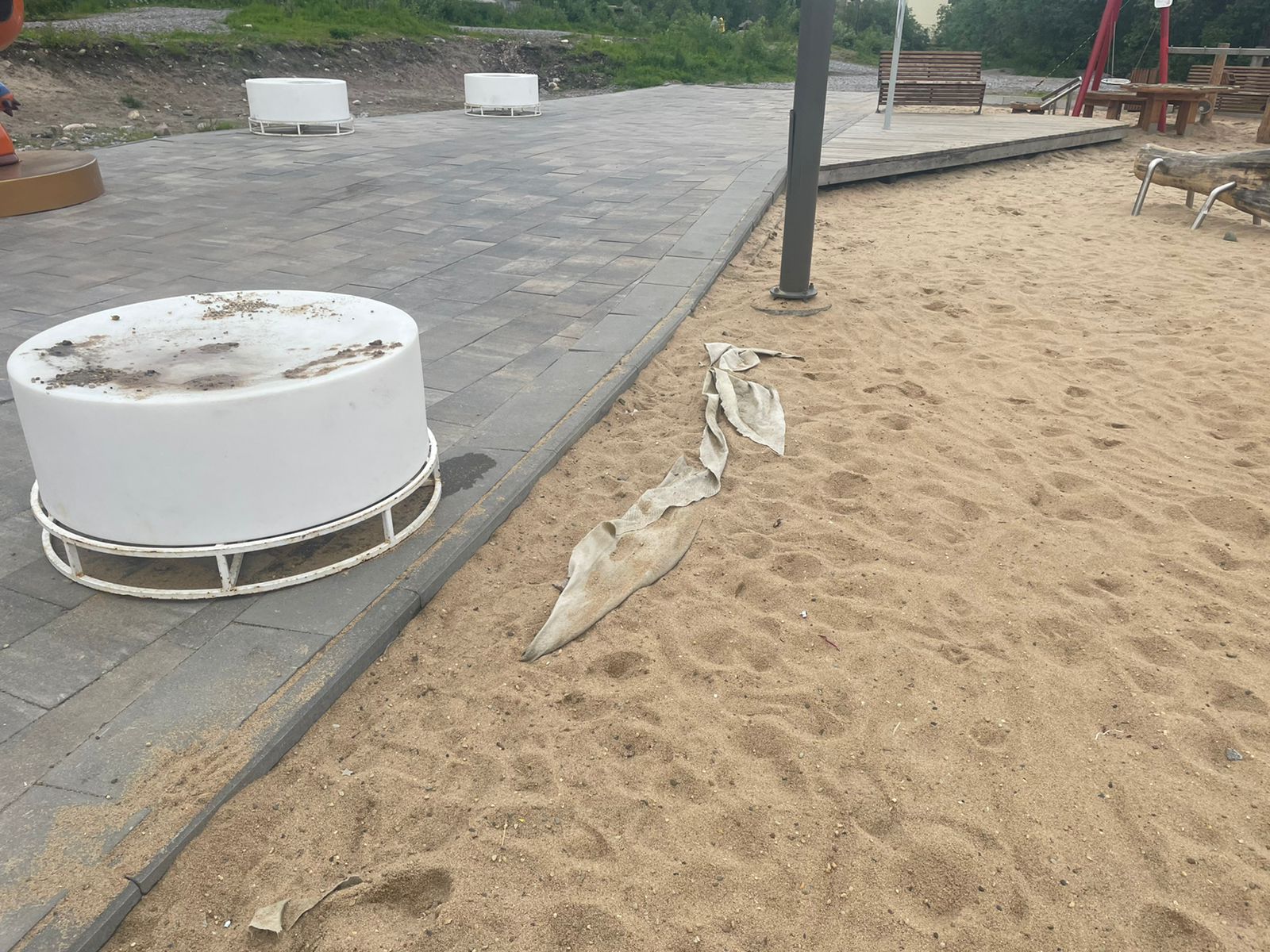 В ходе осмотра детской площадки «Полянка Полярника» выявлено наличие загрязнений по периметру объекта, повреждение отдельных элементов игрового оборудования, в том числе защитной сетки, отсутствие на игровом оборудовании информационных стендов, содержащих правила и возрастные требования при его пользовании.