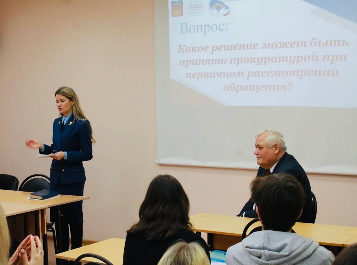 В преддверии Дня Конституции Российской Федерации старший прокурора отдела по надзору за исполнением федерального законодательства прокуратуры области Екатерина Койпиш приняла участие в Молодежном правовом форуме «Мои права_Просвещайся вместе с нами», организованном на базе Северо – Западного института (филиала) АНО ВО «Московский гуманитарно – экономический университет» Молодежным общественным советом при Уполномоченном по правам человека в Мурманской области.