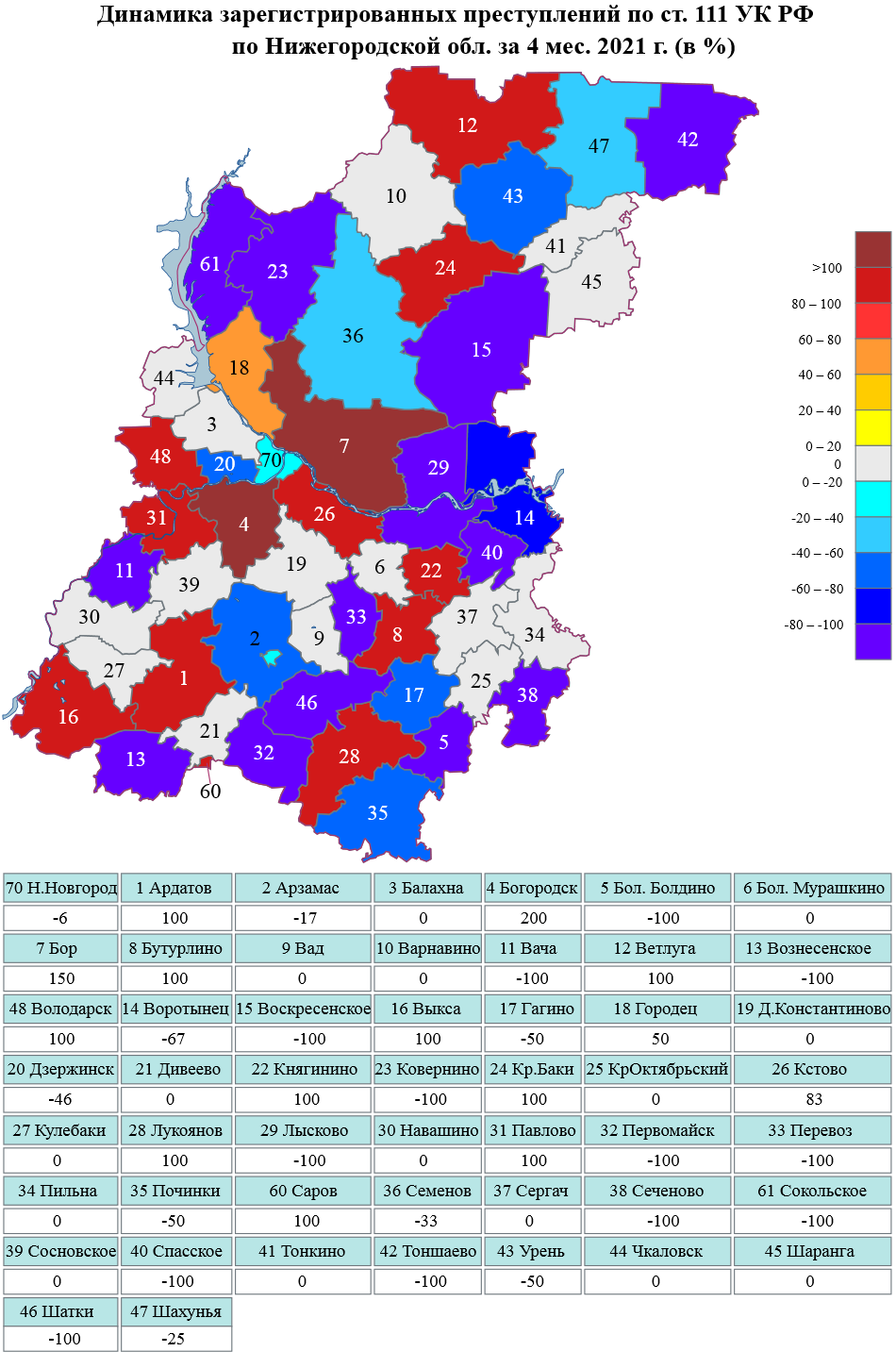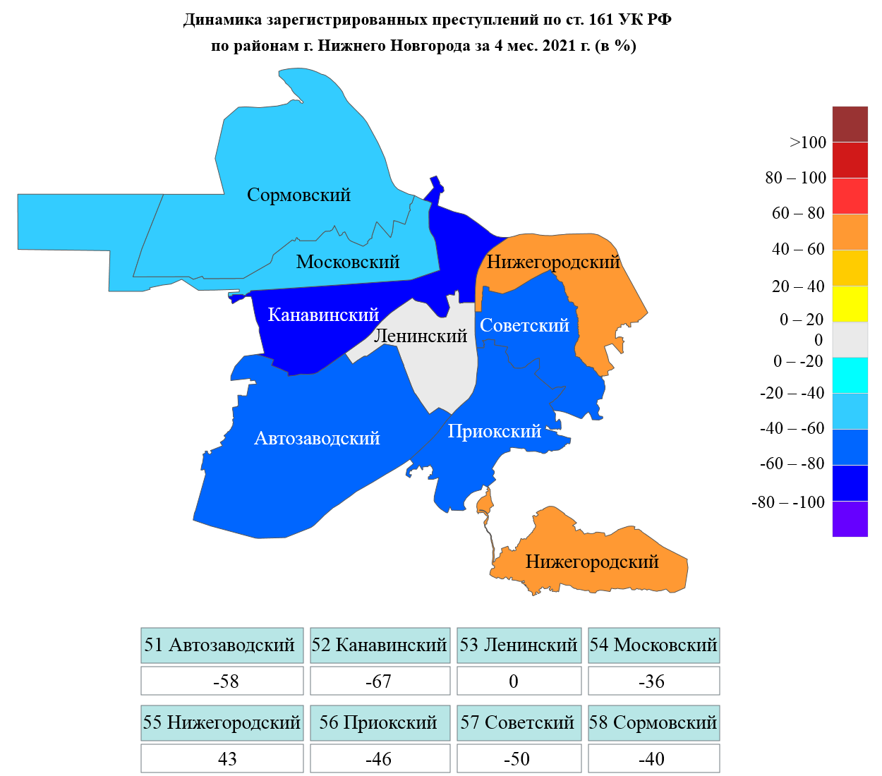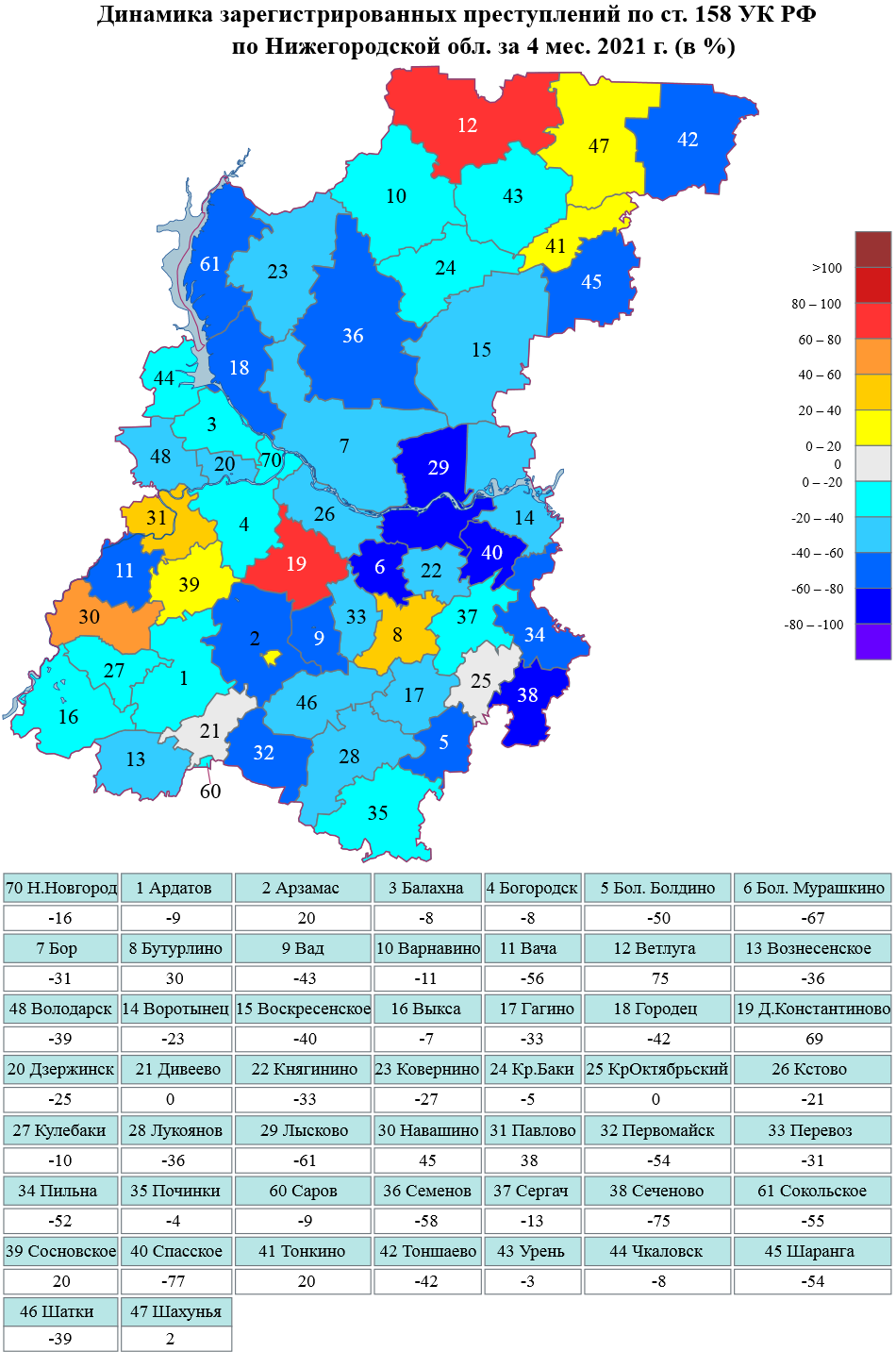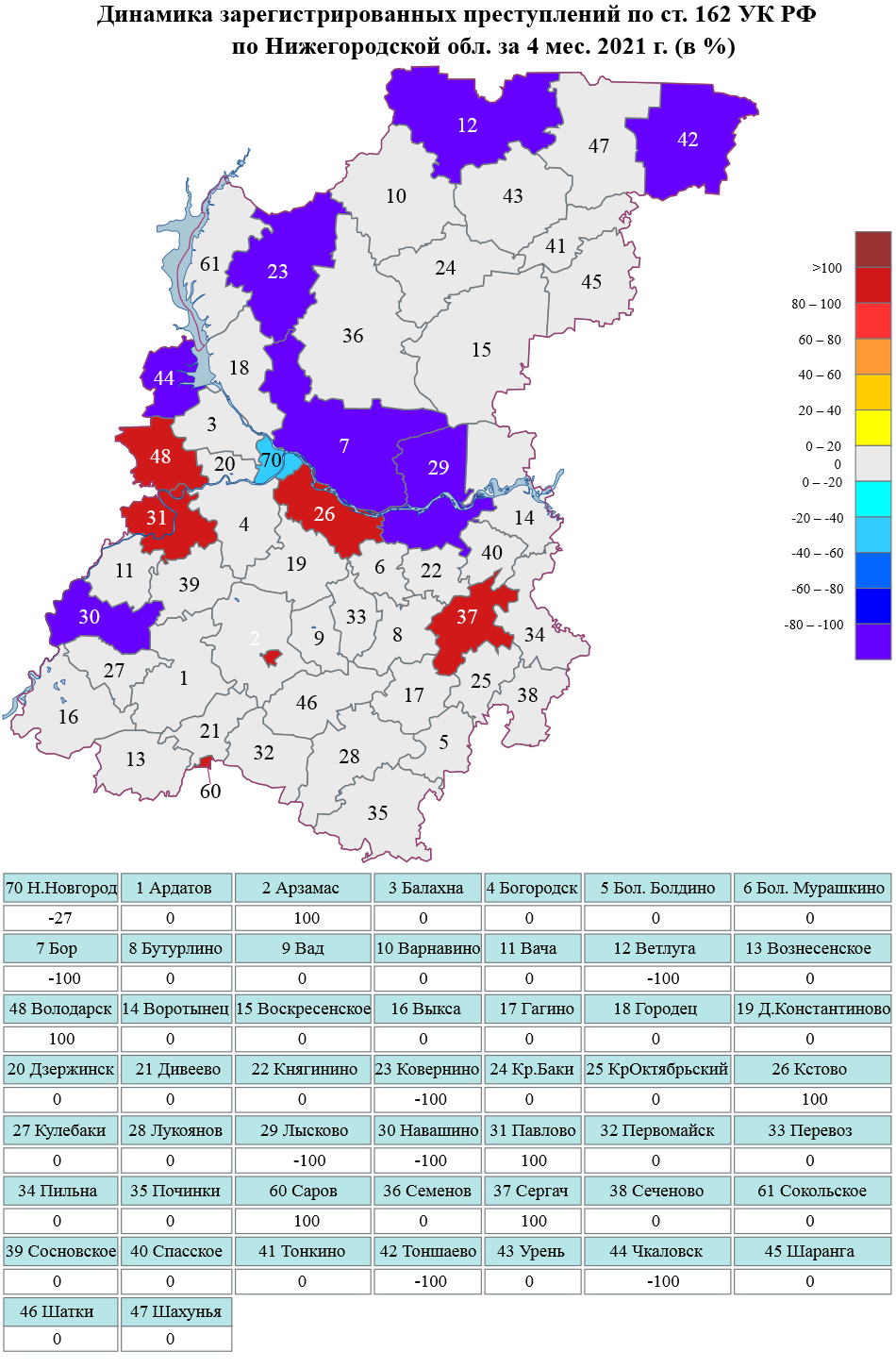 Сведения о динамике зарегистрированной преступности на картах Нижегородской области и г.Н.Новгорода за январь-апрель 2021 г.
