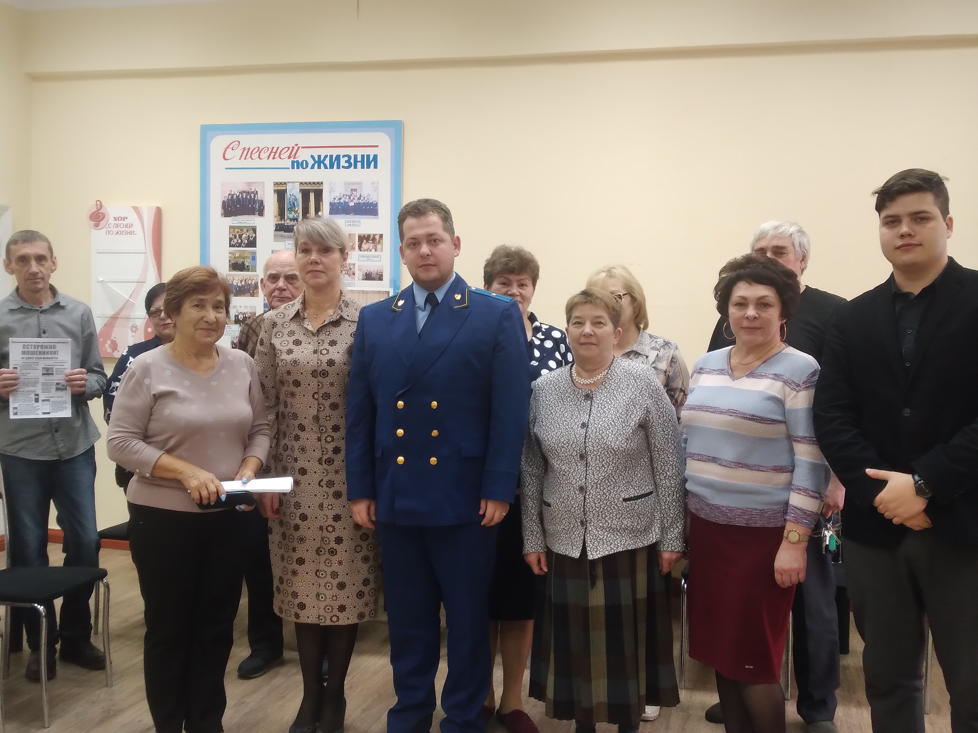 Работники прокуратуры Калининского района г. Новосибирска Сергей Бачурин и Павел Гилев выступили в Доме культуры им. М. Горького с лекциями для пенсионеров и ветеранов труда по вопросам социальных прав на лекарственное обеспечение, на компенсацию расходов по оплате коммунальных услуг, по уплате взносов на капитальный ремонт, а также разъяснили способы защиты от мошенничества с использованием сети «Интернет» и телефонной связи. Слушателям выданы памятки «Осторожно мошенники!».