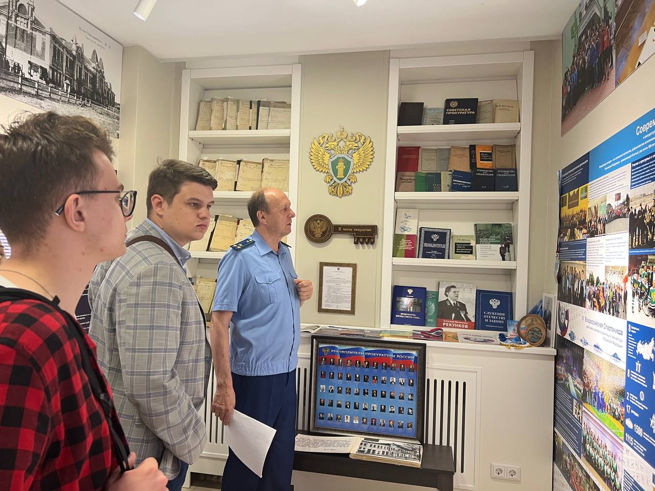 После чего пенсионером прокуратуры Владимиром Федоровичем Самочерновым проведена экскурсия в музее прокуратуры Новосибирской области, где студентам показаны фотографии работников прокуратуры времен СССР, участников Великой Отечественной войны, современного периода, а также подлинные документы и предметы, имеющие отношение к деятельности прокуроров.