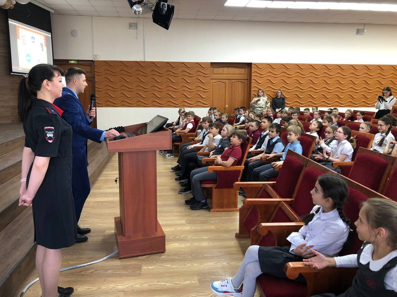 Прокурор кассационного отдела уголовно-судебного управления прокуратуры области Сергей Янович и инспектор Госавтоинспекции города Новосибирска Любовь Бочкарева провели викторину по ПДД ученикам начальных классов МАОУ г.Новосибирска «Вторая Новосибирская гимназия».
