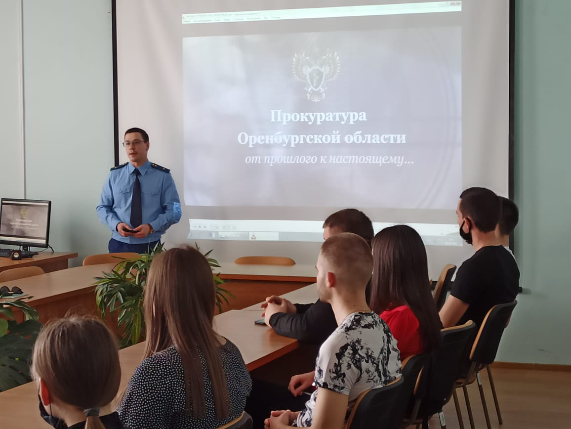 Лекцию для будущих юристов прокурор посвятил предстоящему 300-летию прокуратуры России. Студенты узнали об истории создания, становления и полномочиях органов прокуратуры РФ. Подробно Илья Сапсай остановился на истории создания и становления прокуратуры Оренбургской области, отдельных этапах ее развития после Октябрьской революции и распада СССР, функциях и полномочиях надзорного органа в настоящее время, роли и значении ведомства в сфере противодействия преступности и реализации полномочий на досудебных стадиях уголовного судопроизводства. Также студентам продемонстрировали презентационный фильм «От прошлого к настоящему», подготовленный прокуратурой Оренбургской области.