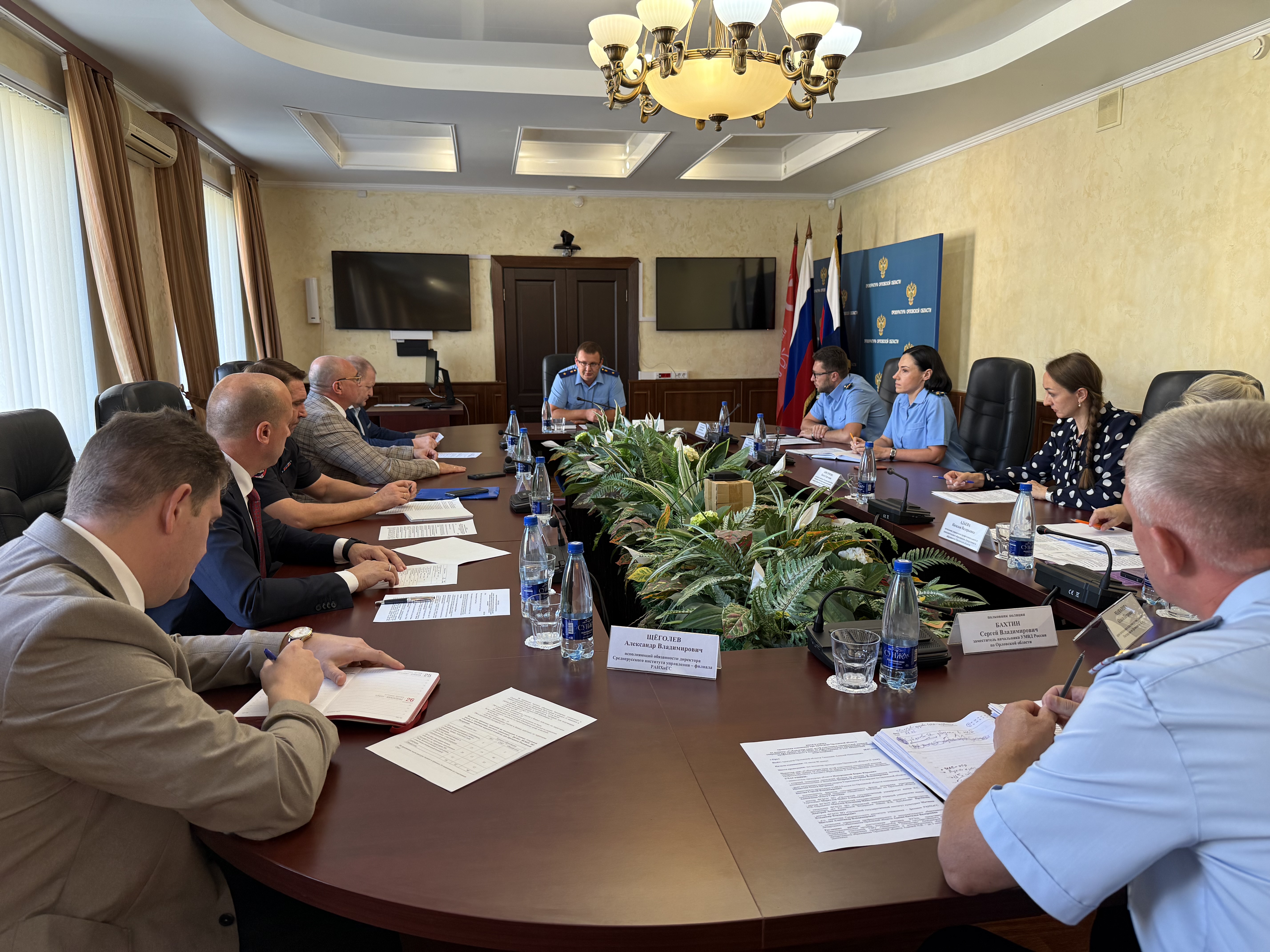 В совещании приняли участие заместитель прокурора области Борис Непорожный, и.о. ректора ФГБОУ ВО «Орловский государственный университет имени И.С. Тургенева» Павел Меркулов, ректор ФГБОУ ВО «Орловский государственный аграрный университет имени Н.В. Парахина» Владимир Масалов, - начальник ФГКОУ ВО «Орловский юридический институт Министерства внутренних дел Российской Федерации имени В.В. Лукьянова» Дмитрий Проказин, ректор ФГБОУ ВО «Орловский государственный институт культуры» Владимир Матвеев, и.о. директора Среднерусского института управления – филиала РАНХиГС Александр Щеголев, работники аппарата прокуратуры региона, департамента образования Орловской области, сотрудники региональных управлений Росгвардии и МВД, руководитель филиала государственного фонда поддержки участников специальной военной операции «Защитники Отечества» по Орловской области Ольга Анисимова.