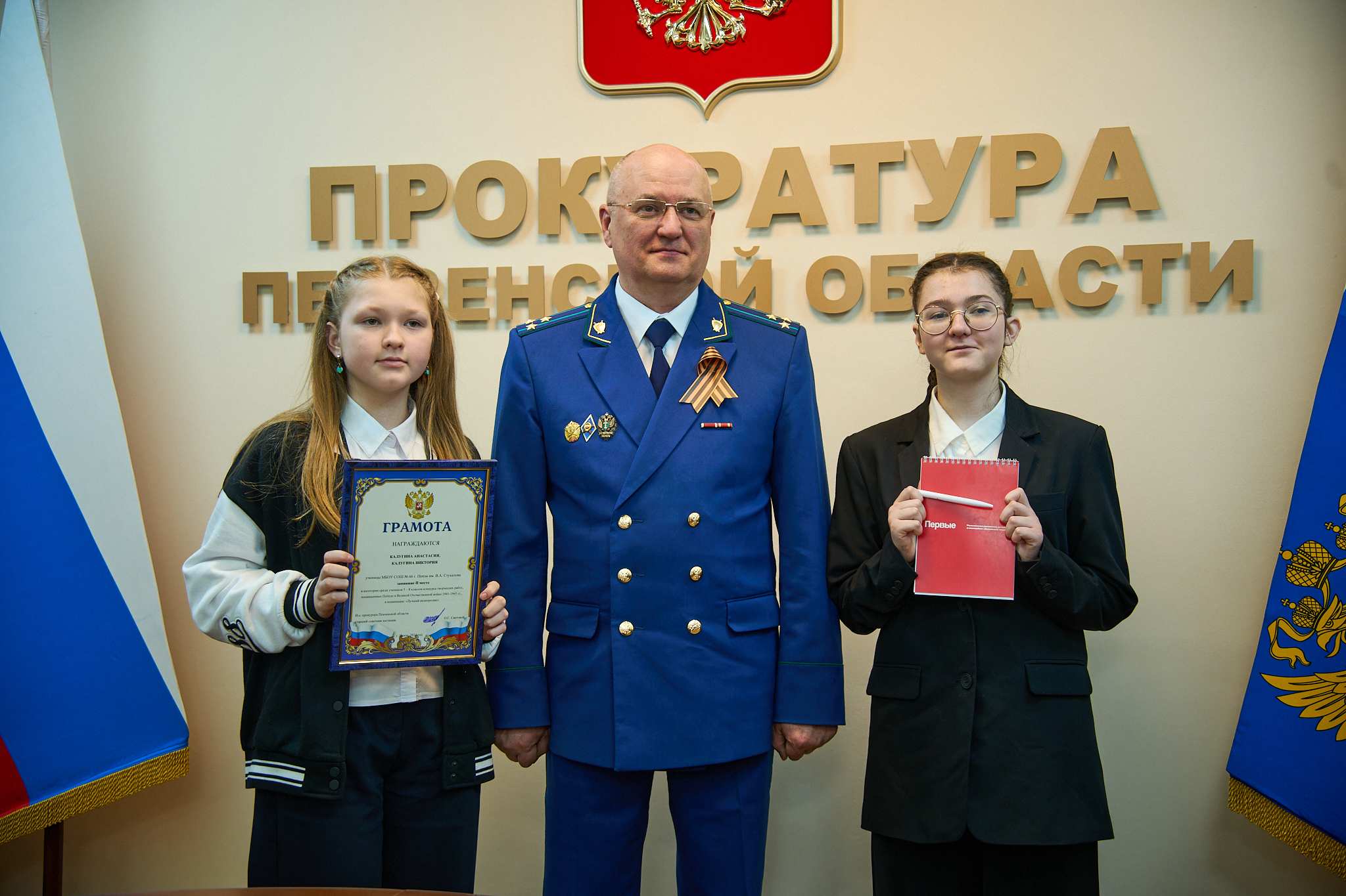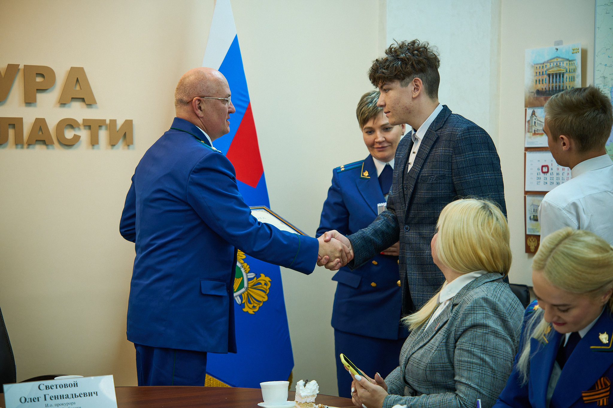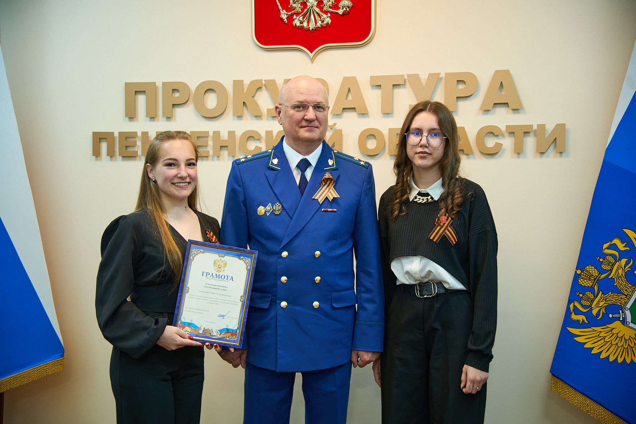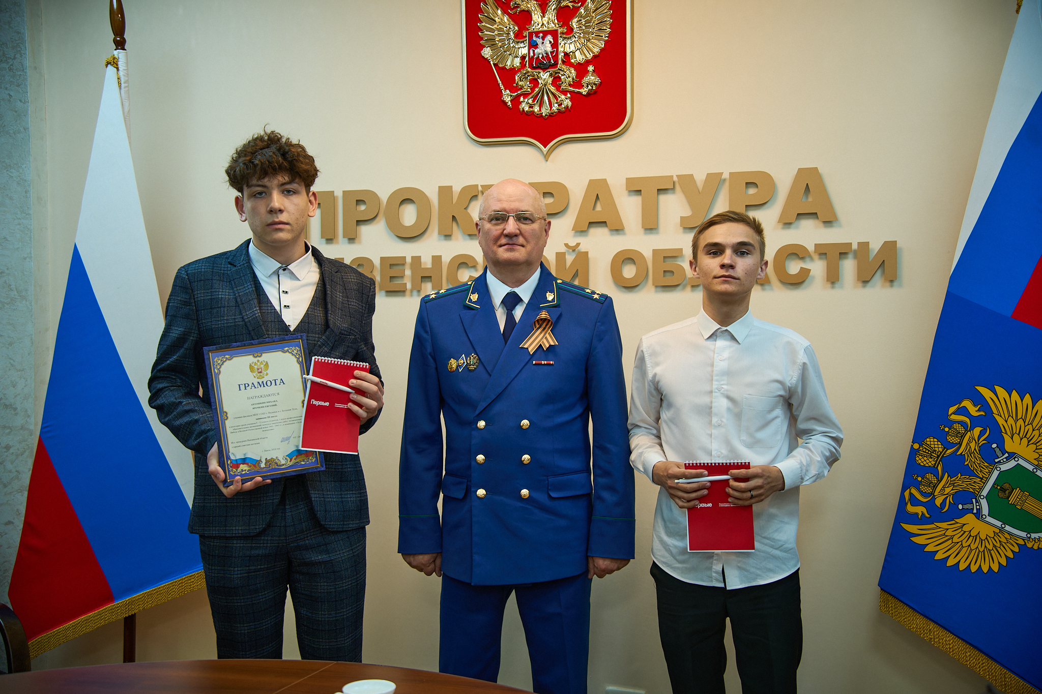 Исполняющий обязанности прокурора Пензенской области Олег Световой совместно с председателем регионального отделения общероссийского общественно–государственного движения детей и молодежи «Движение Первых» Сергеем Холюковым 08.05.2024 в торжественной обстановке вручил почетные грамоты и подарки победителям конкурса творческих работ, посвященных 79-ой годовщине Победы в Великой Отечественной войне 1941-1945 г.г.