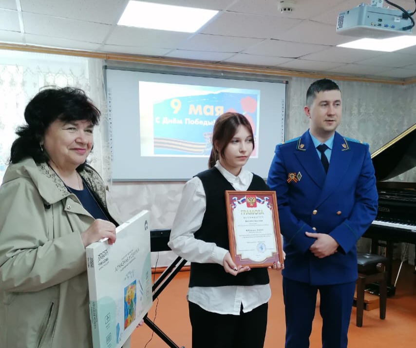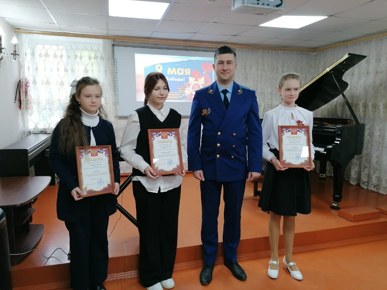 На торжественном мероприятии, состоявшемся в Детской школе искусств, прокурор Белинского района Ильяс Карамышев поздравил ребят, их родителей и наставников с наступающим Днем Победы и наградил победителей конкурса грамотами и подарками.