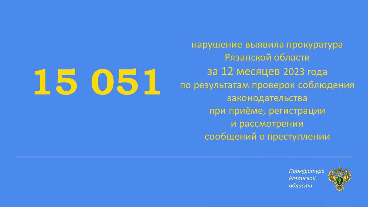 4. 15 051 нарушение выявила прокуратура Рязанской области по результатам проверок соблюдения законодательства при приеме, регистрации и рассмотрении сообщений о преступлении.