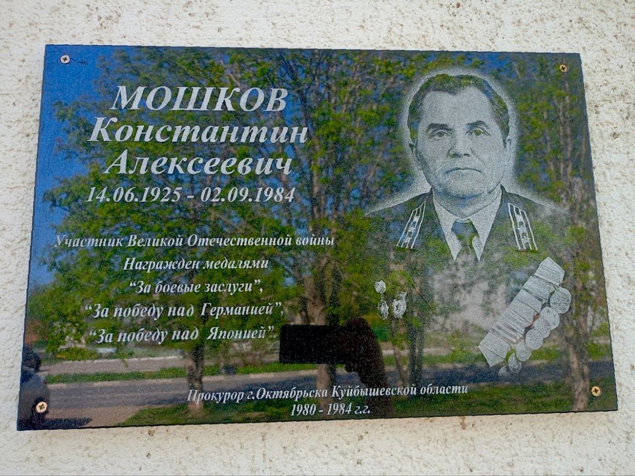 Мемориальная доска, посвященная ветерану Великой Отечественной войны, работнику прокуратуры г. Октябрьска Куйбышевской (Самарской) области Мошкову Константину Алексеевичу.