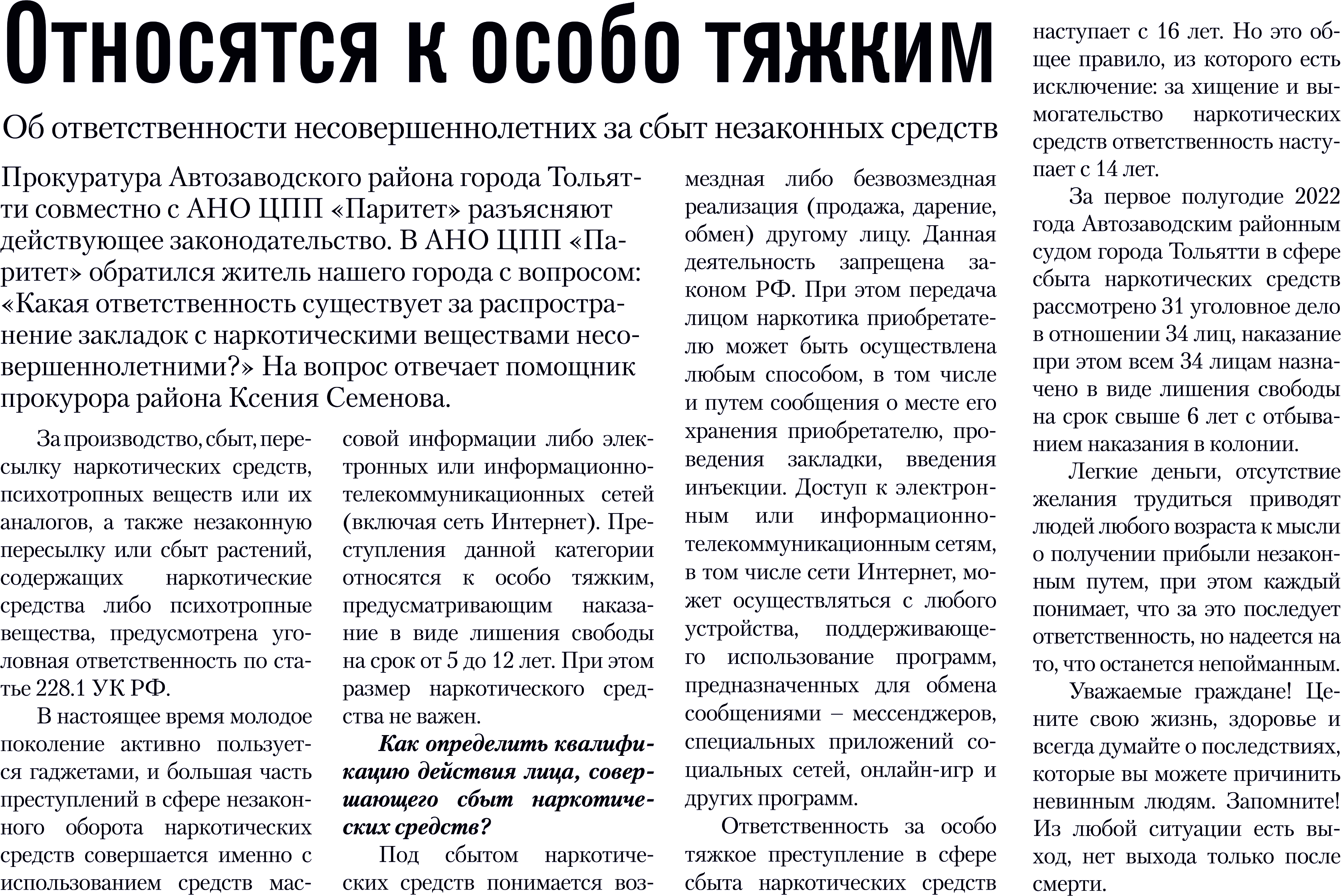 Прокуратура Автозаводского района г. Тольятти разъясняет: "Какая ответственность за сбыт незаконных средств несовершеннолетними?"