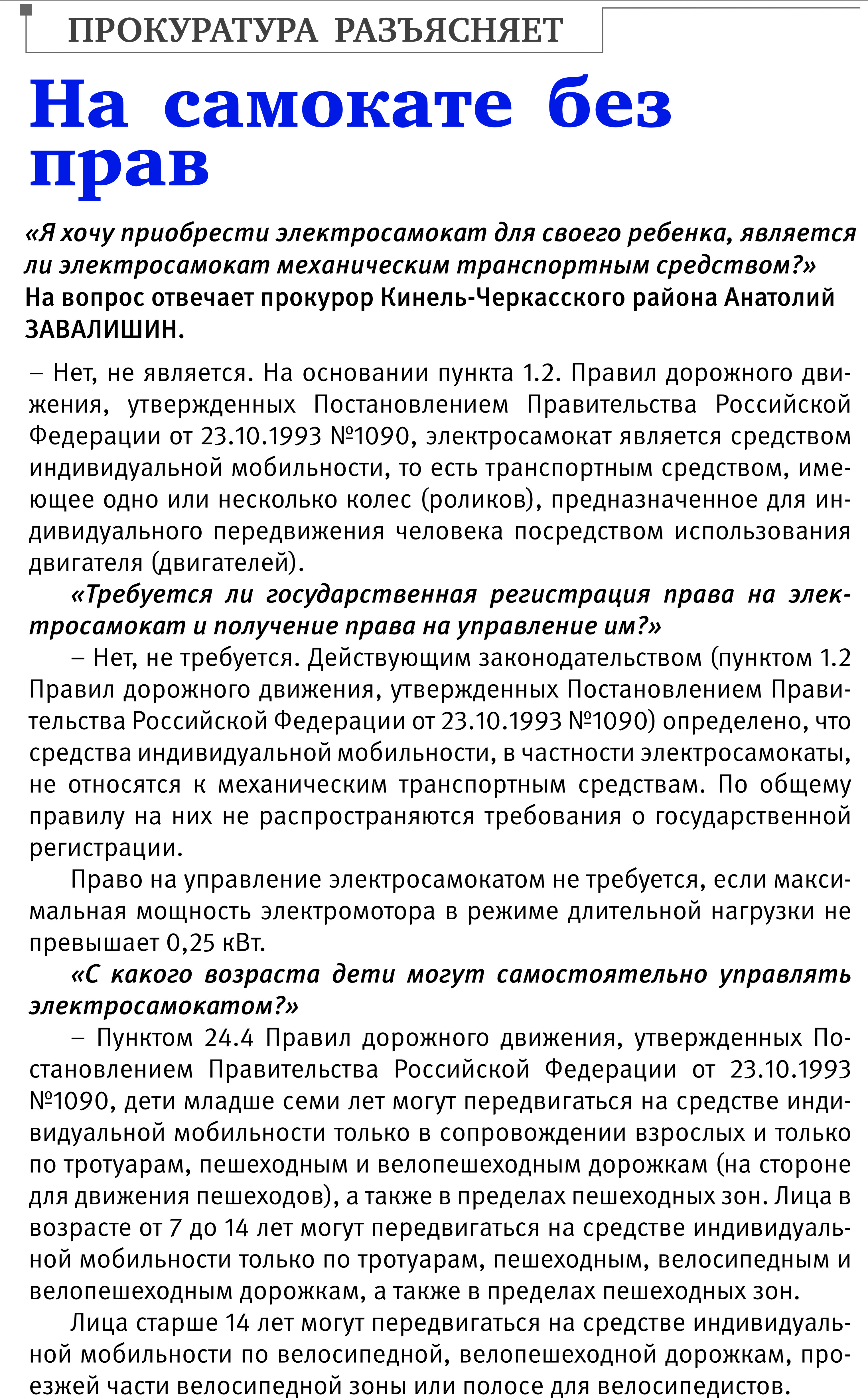 Прокуратура Кинель-Черкасского района разъясняет: На электросамокате и без прав, а можно?