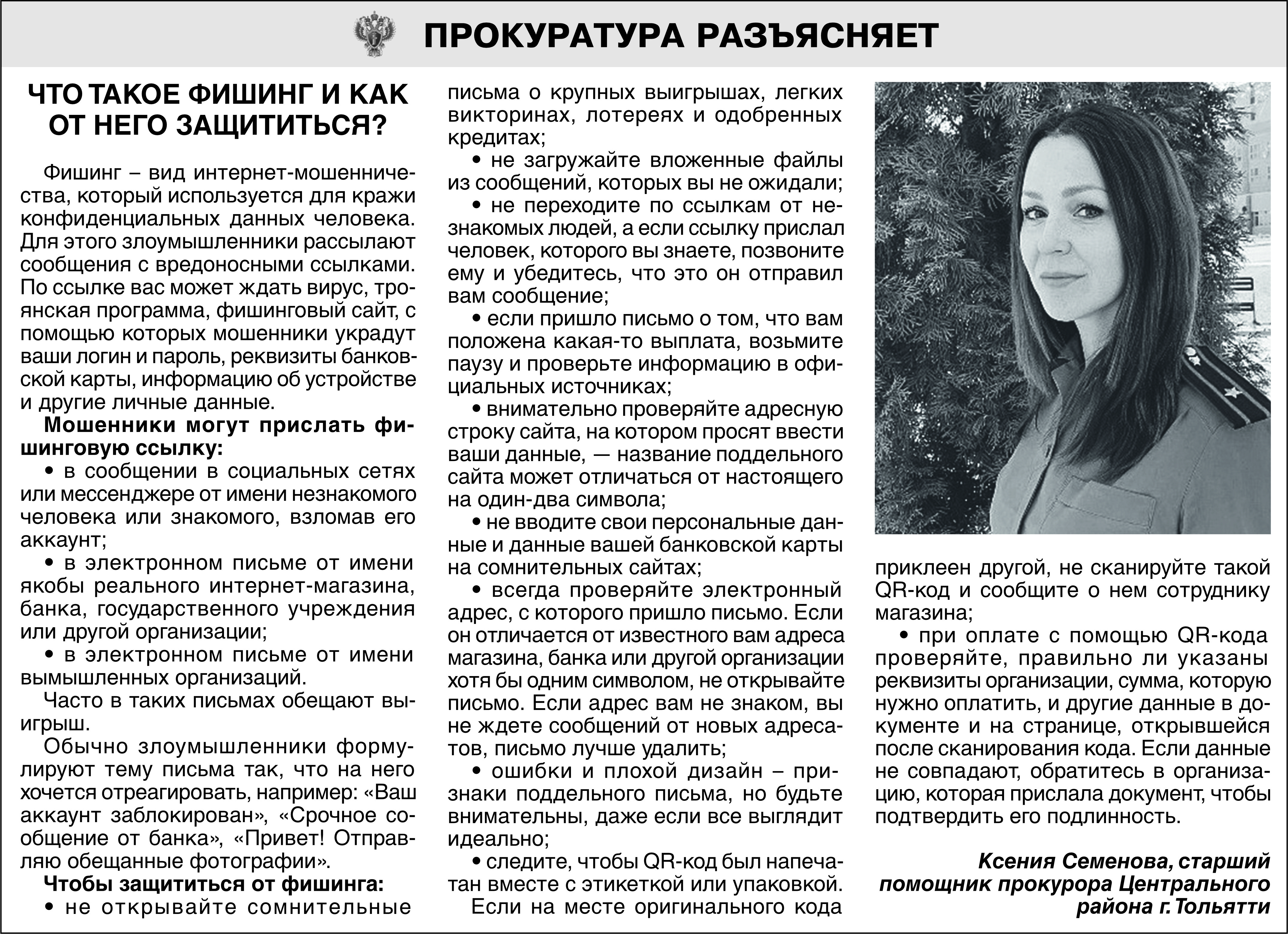 Прокуратура Центрального района г. Тольятти разъясняет: Что такое фишинг и как от него защититься.