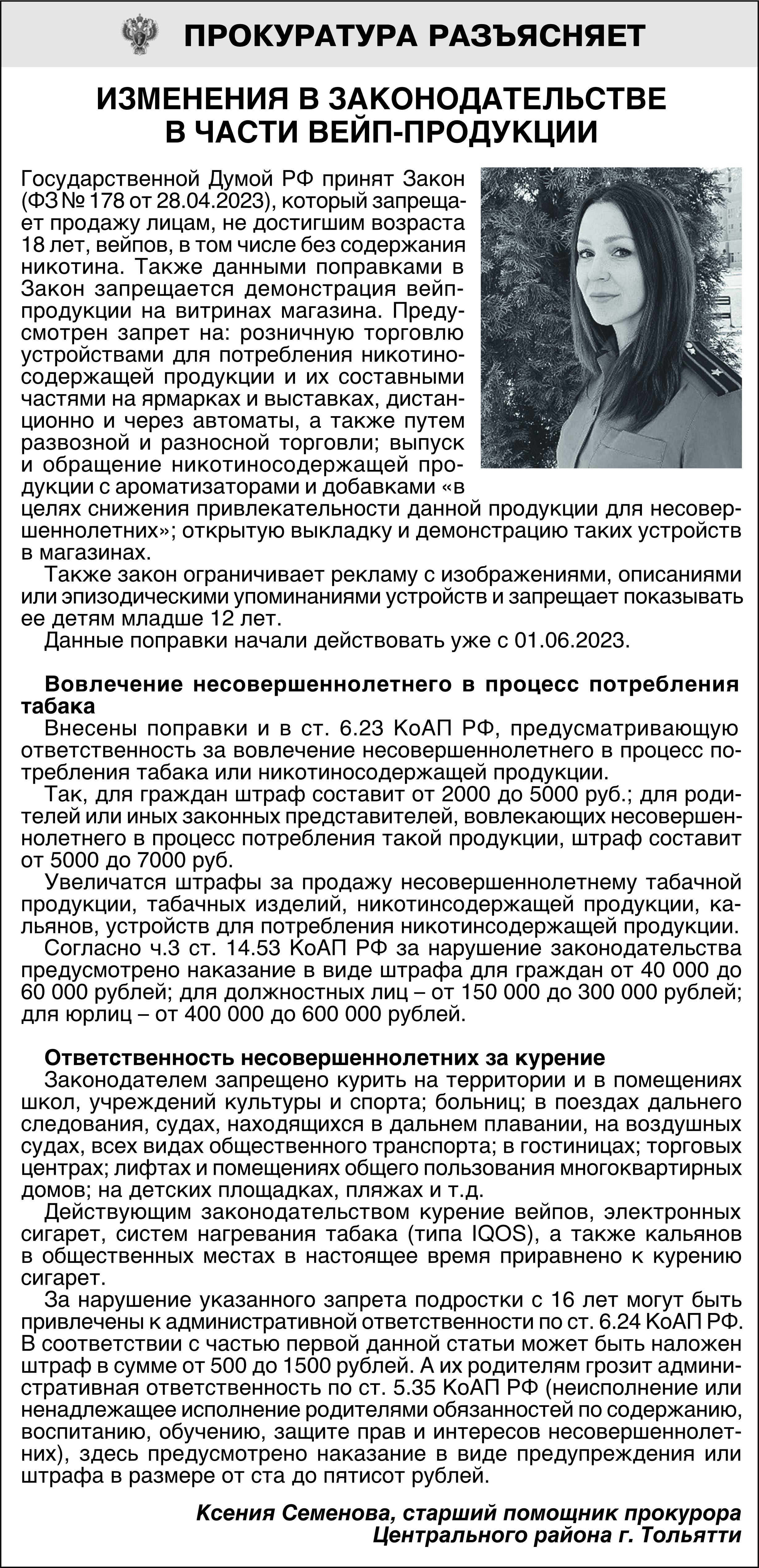 Прокуратура Центрального района г. Тольятти разъясняет: Изменения законодательства по применения вейп-продукции
