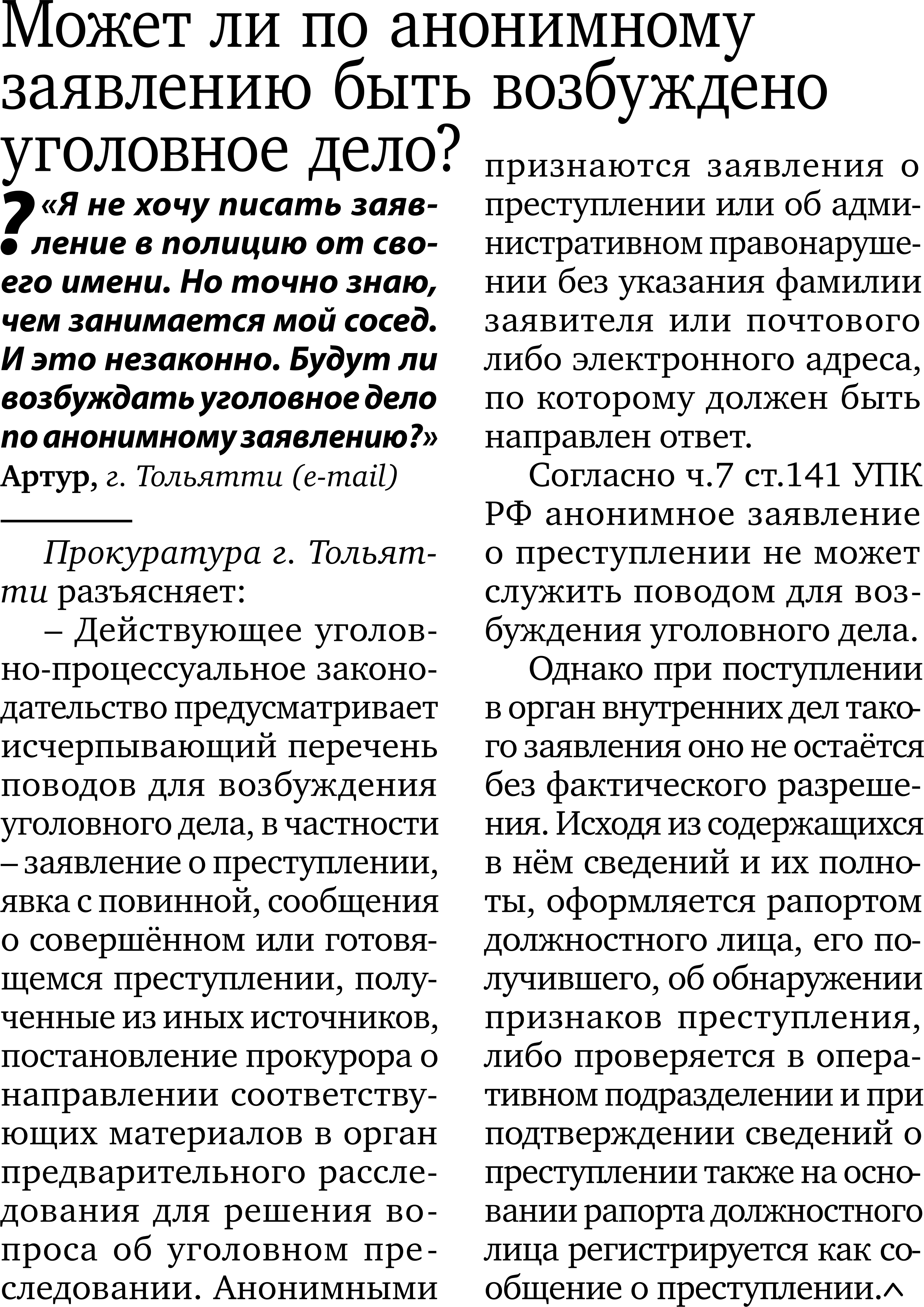 Могут ли возбудить уголовное дело по анонимному сообщению? Прокуратура г. Тольятти разъясняет.