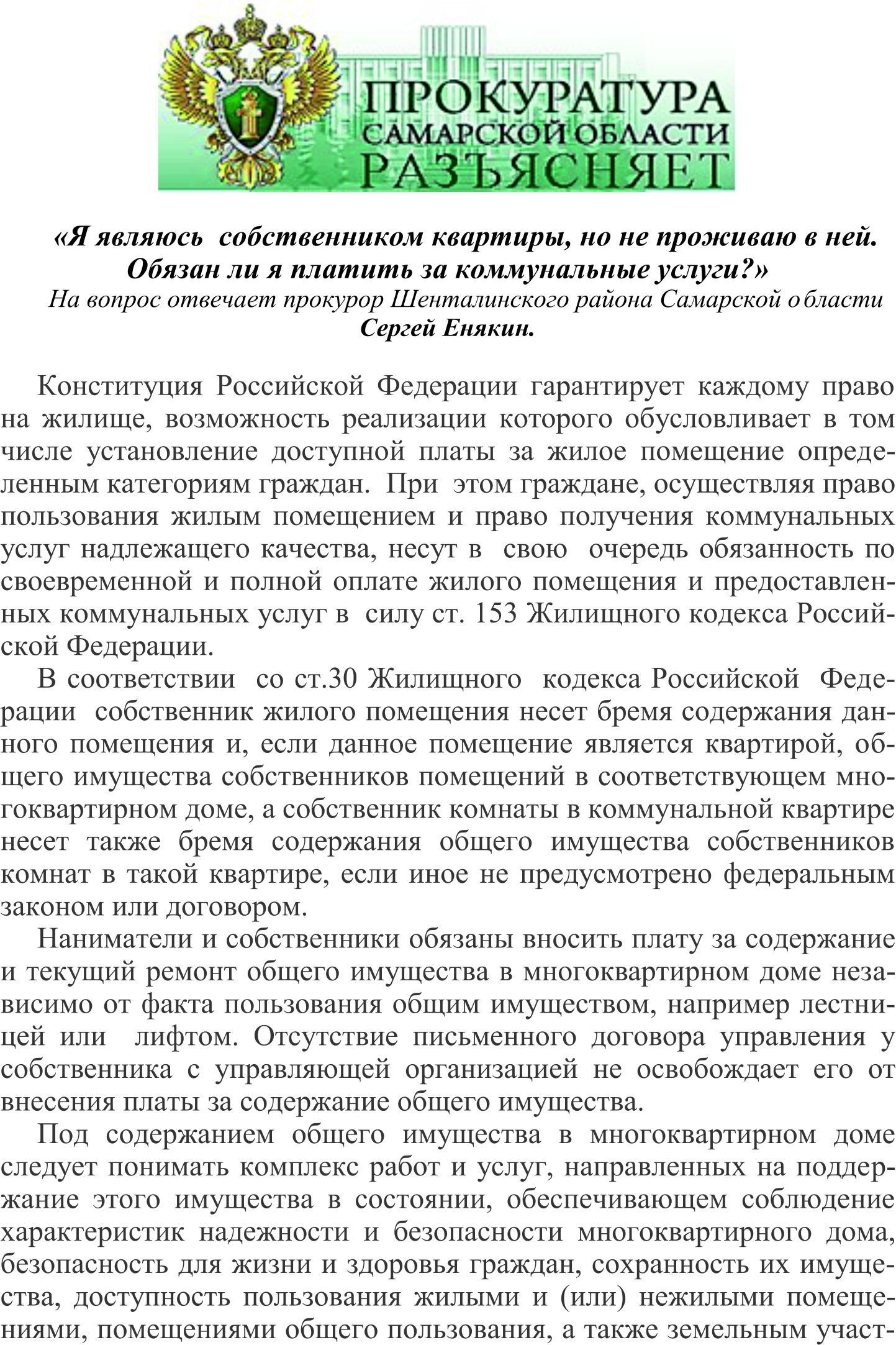 Я являюсь собственником квартиры, но не проживаю в ней. Обязан ли я платить за коммунальные услуги. Прокуратура Шенталинского района разъясняет