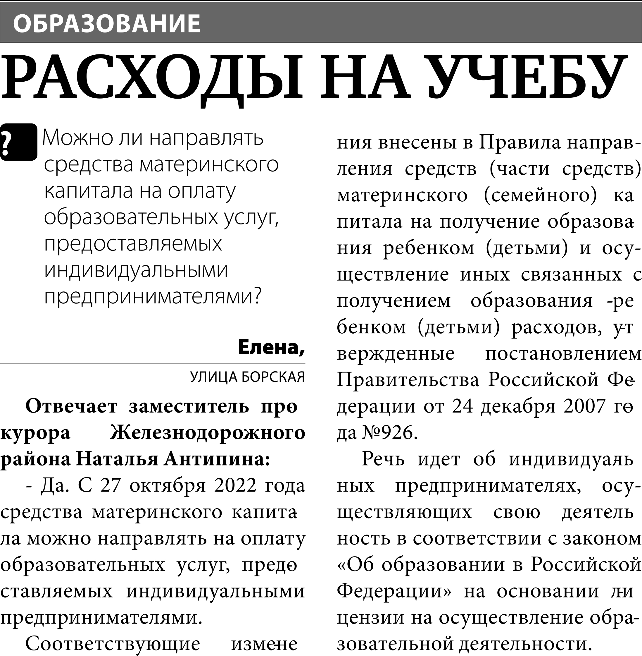 Можно ли расплачиваться материнским капиталом за обучение у ИП? Прокуратура Железнодорожного района г. Самары разъясняет.