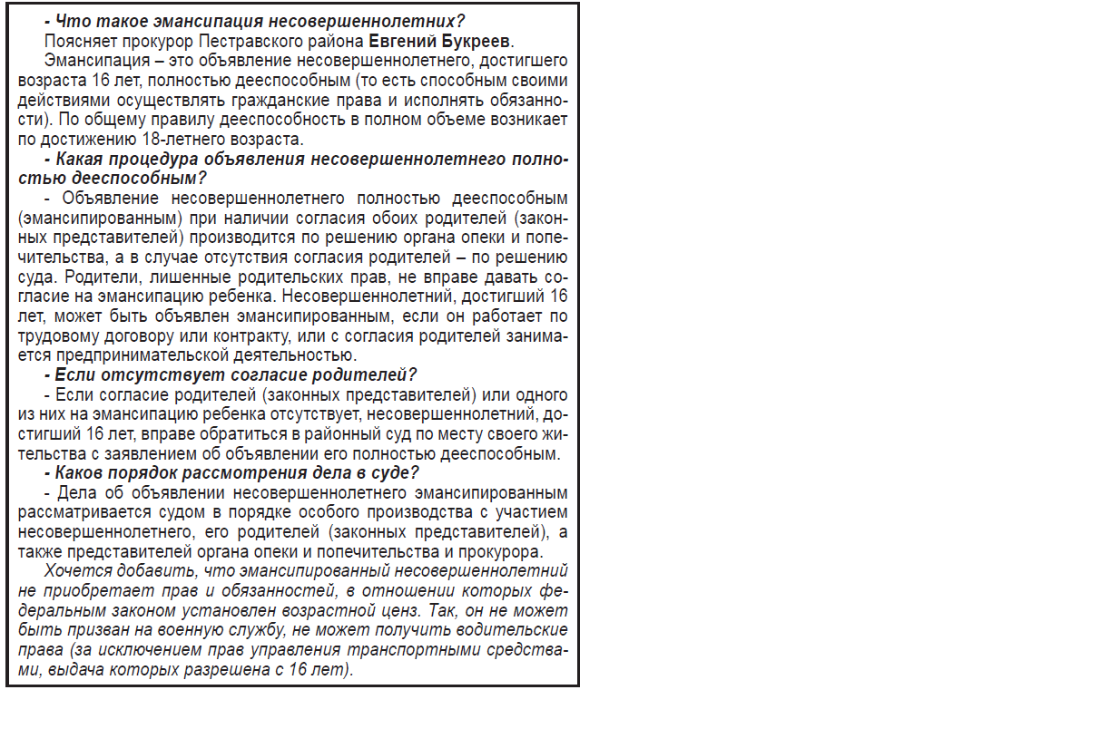 Прокуратура Пестравского района разъясняет: "Что такое эмансипация несовершеннолетних"