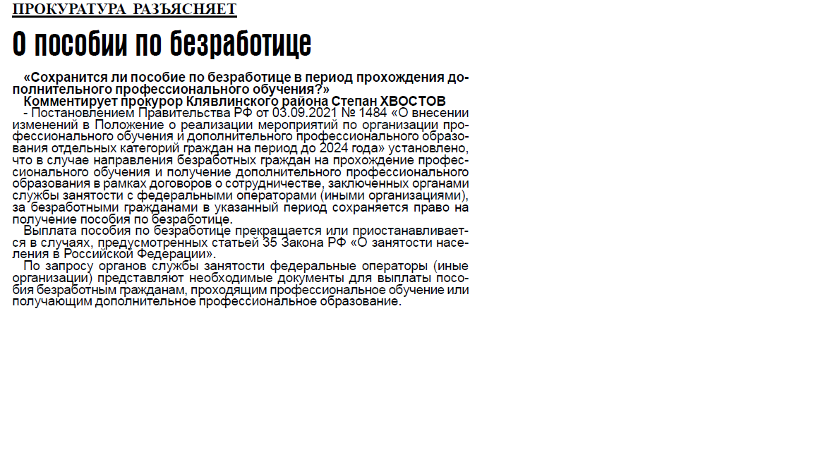 Прокуратура Клявлинского района разъясняет: "О пособии по безработице"