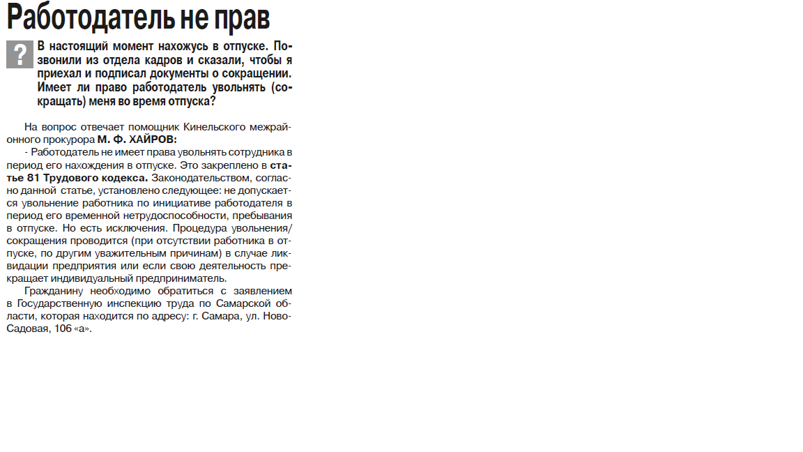 Кинельская межрайонная прокуратура разъясняет: "Работодатель не прав"