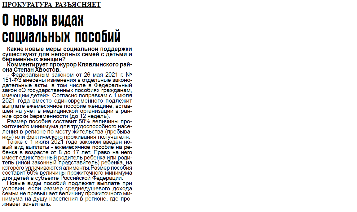 Прокуратура Клявлинского района разъясняет: "О видах социального пособия для беременных женщин"