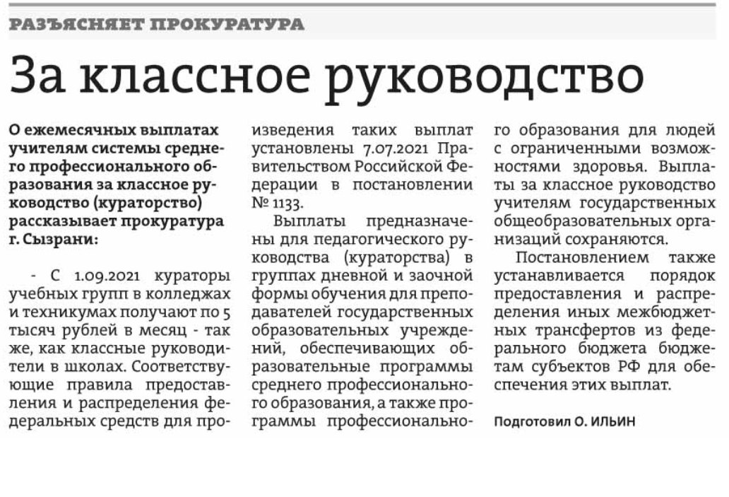 Прокуратура г. Сызрани разъясняет: "О ежемесячных выплатах учителям за классное руководство"