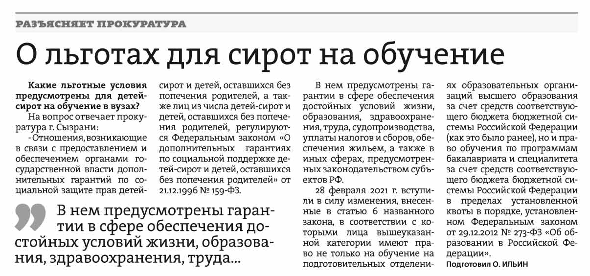 Прокуратура г. Сызрани разъясняет: "О льготах для сирот на обучение"